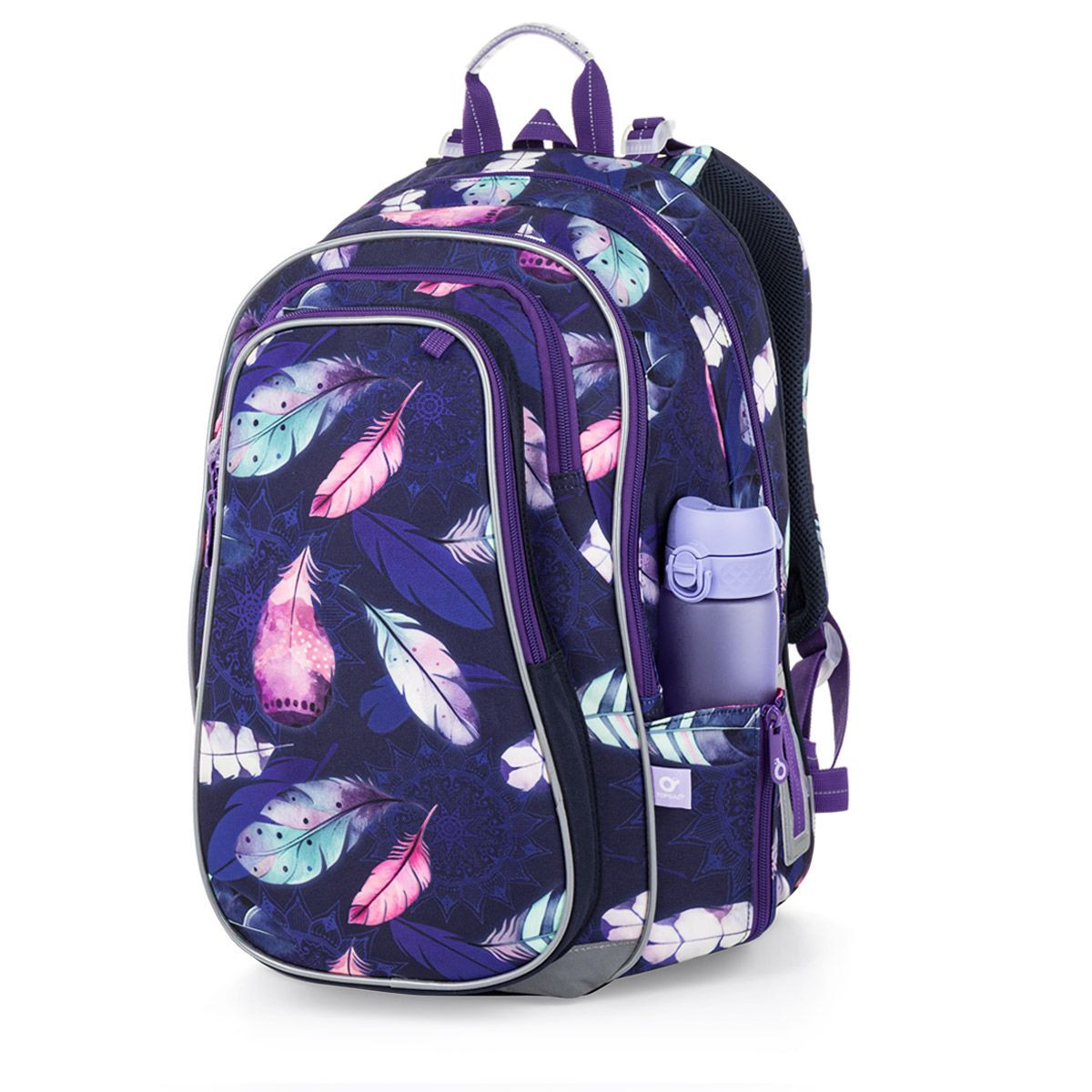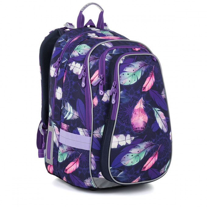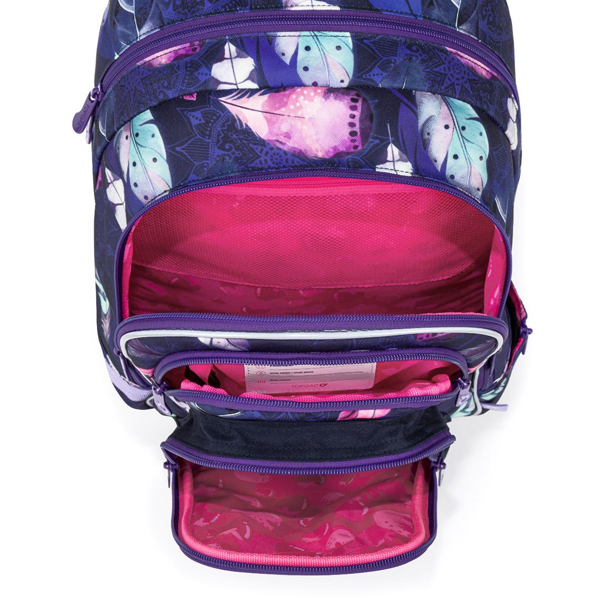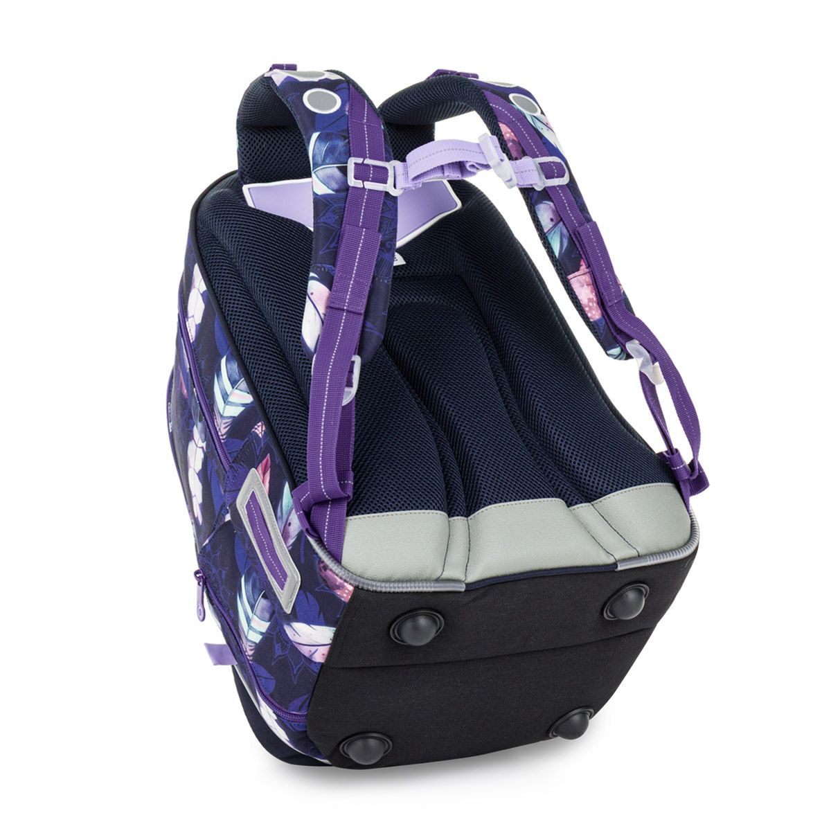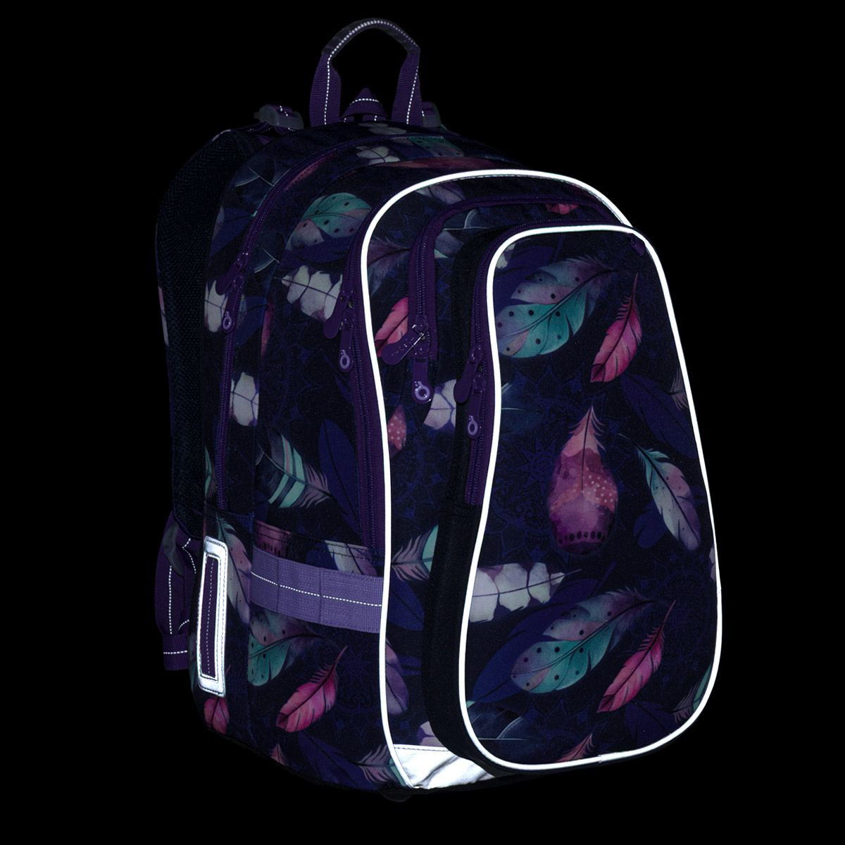 Školní batoh LYNN je prostorný dvoukomorový model, který skvěle sedí školačkám od 1. do 4. třídy. Tmavě fialový design s barevnými pírky v boho stylu působí originálně a elegantně – ideální pro holky, které chtějí batoh, co je bude bavit i několik školních let.