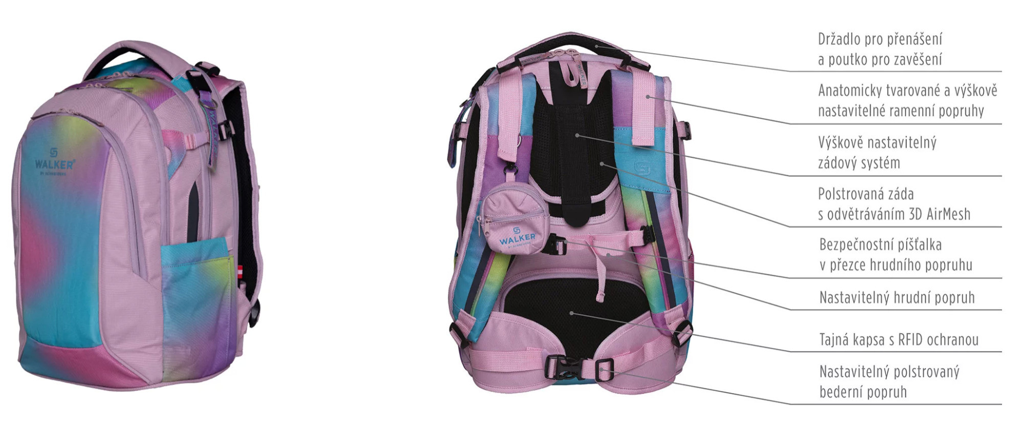 Základem je špičkový ergonomický zádový systém, který lze výškově nastavit ve třech úrovních podle postavy. Batoh je navíc certifikován Ortopedickým institutem Karla Landsteinera, což potvrzuje jeho vysoký standard z hlediska zdravého nošení. Polstrovaná záda podporují cirkulaci vzduchu a spolu s anatomicky tvarovanými popruhy, hrudním a bederním pásem pomáhají rovnoměrně rozložit zátěž a chránit páteř při každodenním nošení.