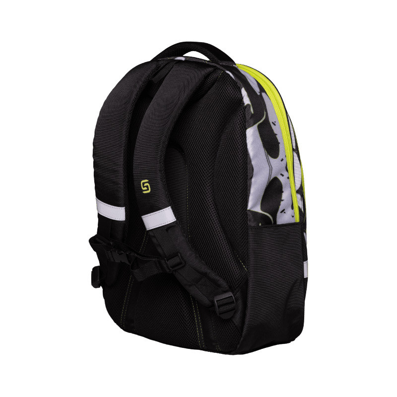 Batoh myslí i na bezpečnost a praktičnost. Reflexní prvky zvyšují viditelnost, některé motivy jsou dokonce přímo reflexní. Uvnitř najdeš kapsu na notebook do 15", přihrádku na tablet, organizér i prostorné komory. Odolný materiál s impregnací chrání obsah před deštěm a z poloviny je vyroben z recyklovaných PET lahví.