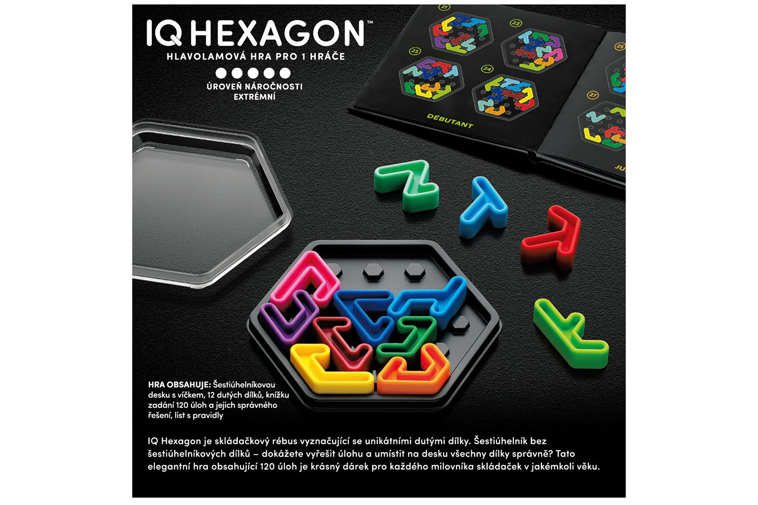 Chytrý hlavolam ze série IQ pro jednoho hráče od 14 let! Hra IQ Hexagon vás zavede do světa šestiúhelníkových dílků, které musíte umístit na hrací desku. V knížce zadání si vyberte jednu z úloh, kde je uvedena startovní pozice některých dílků – umístěte je na desku přesně podle zadání.