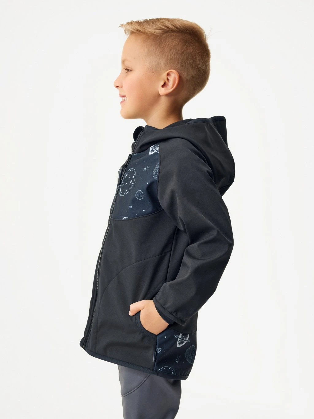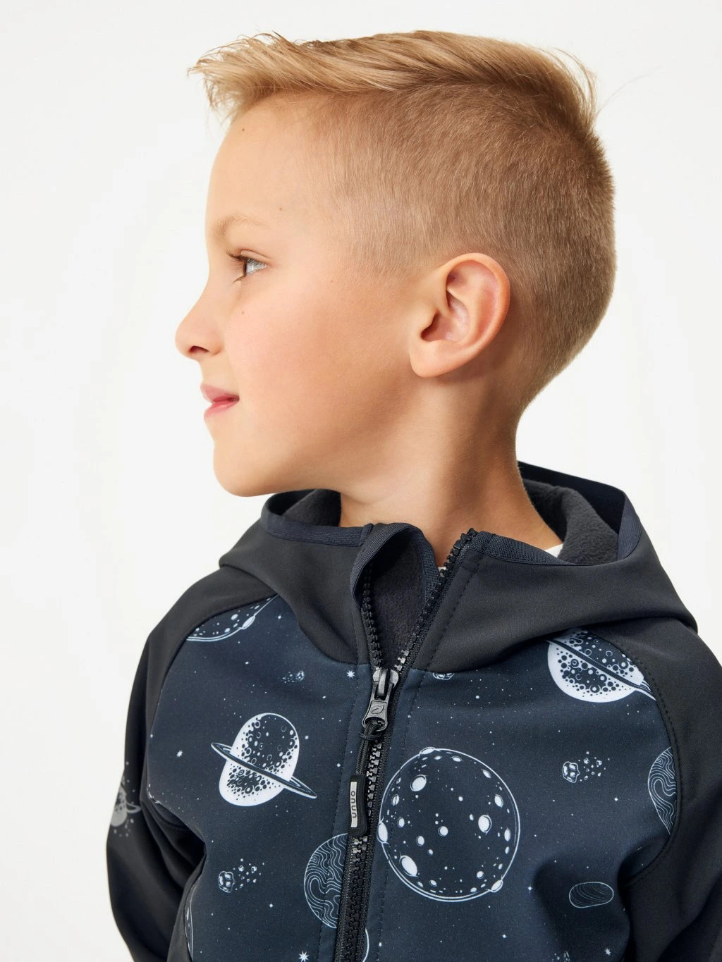 Vesmírná inspirace s potiskem planet přenese děti do světa fantazie a objevování. Softshellová bunda s fleecem a prodyšnou membránou je ideálním společníkem na podzimní a jarní dobrodružství – děti zůstanou v suchu a teple, a přitom se mohou volně pohybovat.