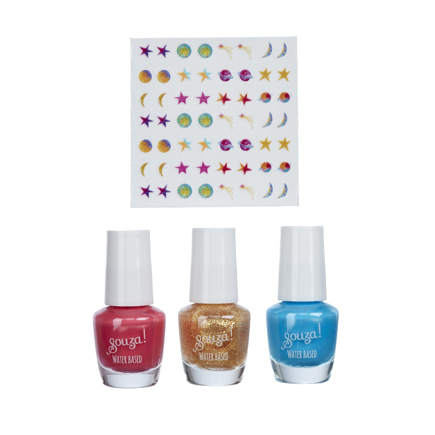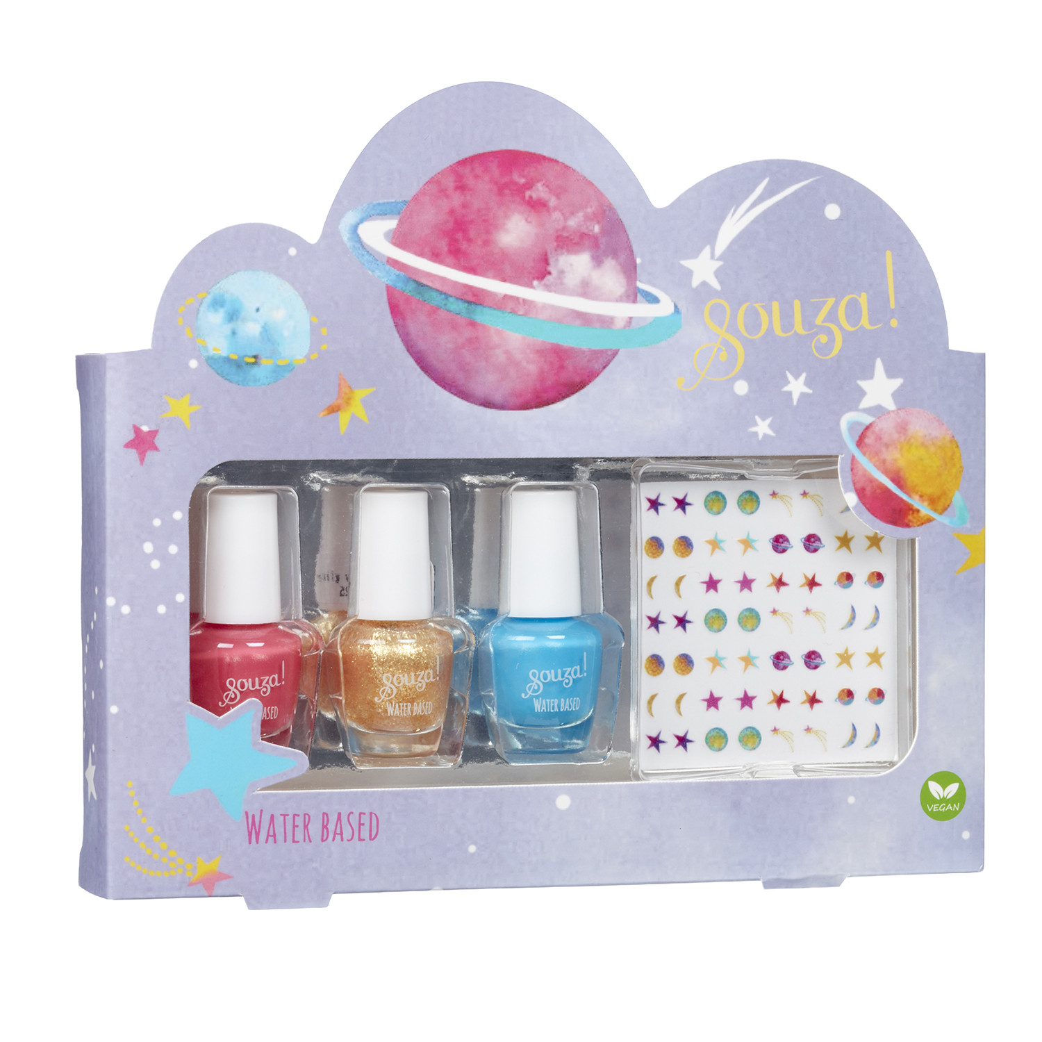 Kosmetická sada pro děti od 3 let obsahuje tři lahvičky laku na nehty a také arch samolepek na nehty s vesmírnou tematikou. Laky na nehty jsou zcela bezpečné, nealergenní a nedráždivé. Na nehtech vytvářejí slupovací vrstvu, díky čemuž se snadno odstraňují (stejně jako samolepky).