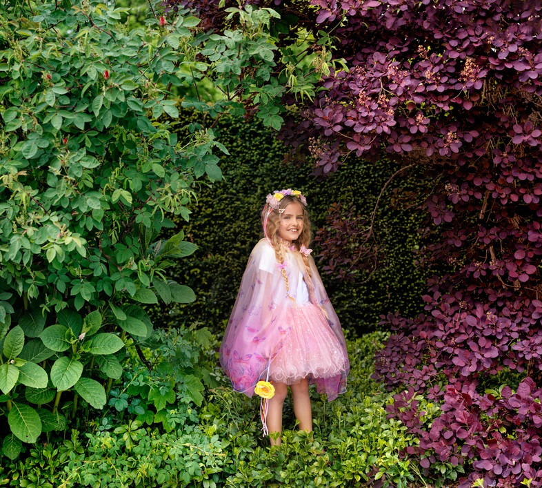 Plášť pro malou vílu s hůlkou a čelenkou. Tento výrazný a lehký plášť pro dívky od 3 let s jemným potiskem motýlů je ideální jako doplněk karnevalového kostýmu nebo jen tak pro každodenní zábavu.