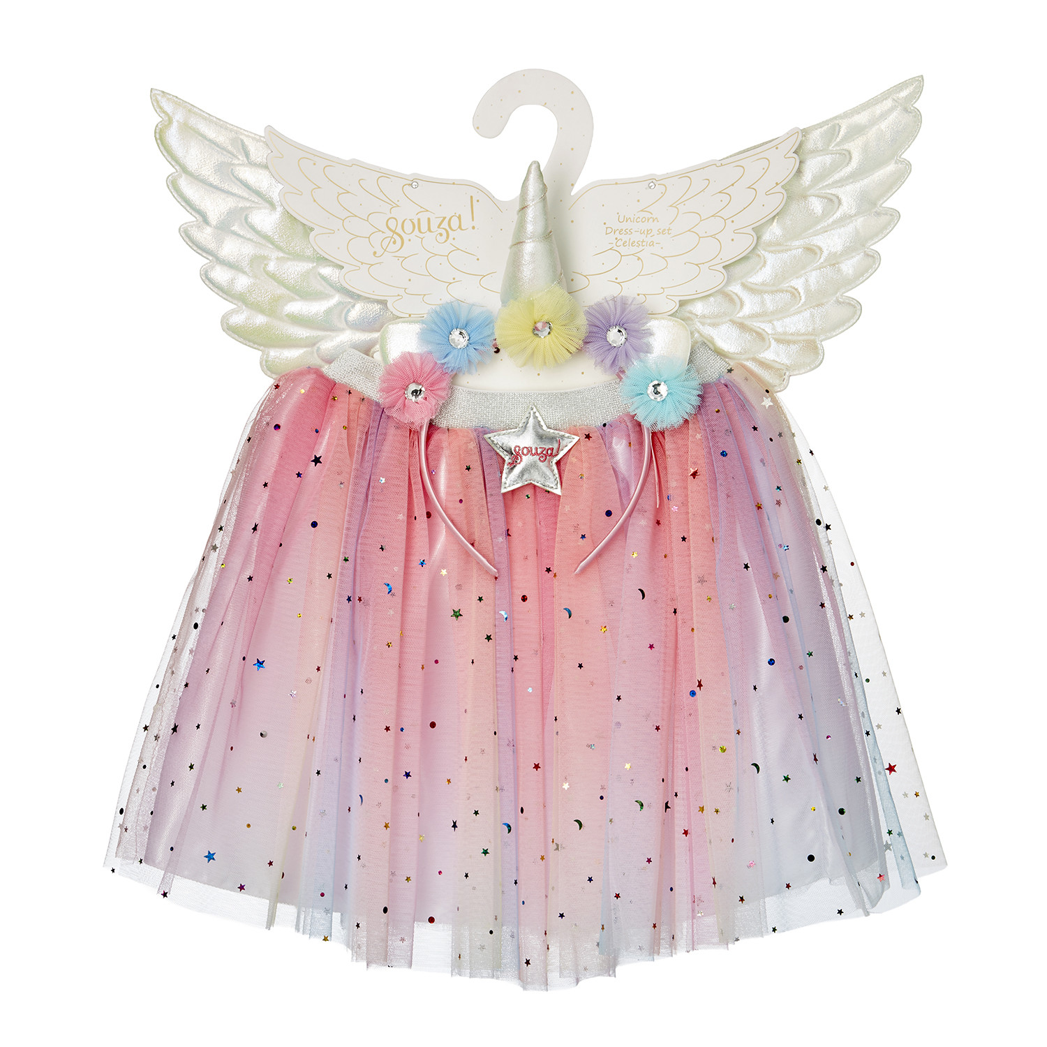 Jednorožec Celestia se těší na velký ples! Vypadá kouzelně a je připravená zazářit během výjimečného večera. Kompletní kostým pro malé milovnice jednorožců zahrnuje tylovou sukni, zdobená křídla a čelenku s rohem a ušima. Sukně je dekorována třpytivými hvězdami, čelenku zdobí barevné tylové bambulky. Elastický pas a lehká křídla na gumičkách zajišťují pohodlí a volnost pohybu při hře.