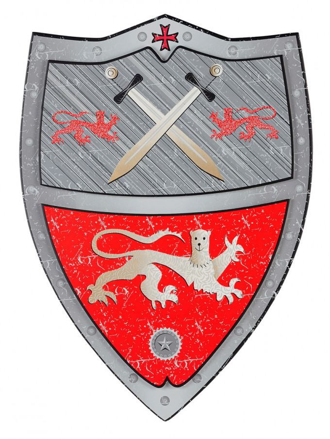 Ideální výbava pro malé rytíře od 3 let, kteří se chystají chránit království a porazit všechny draky! Tento lehký a odolný štít je vyroben z pěny EVA a skvěle doplňuje každý rytířský kostým. Přední stranu zdobí výrazný erb na červeném pozadí a dva zkřížené meče. Na zadní straně se nachází dvě praktická poutka pro snadné uchopení. Díky nízké hmotnosti se pohodlně nosí i menším dětem.