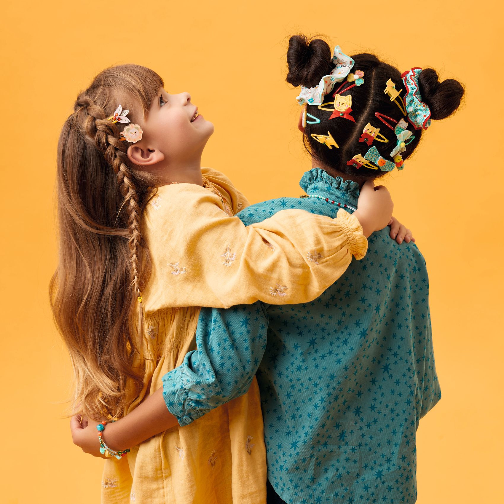 Sada sponek Nina dodá dětskému účesu roztomilý a hravý nádech. Obsahuje dvě kovové sponky zdobené bavlněnou mašlí a třemi akrylovými kočičími hlavami. Jsou lehké, pohodlné a dobře drží po celý den.