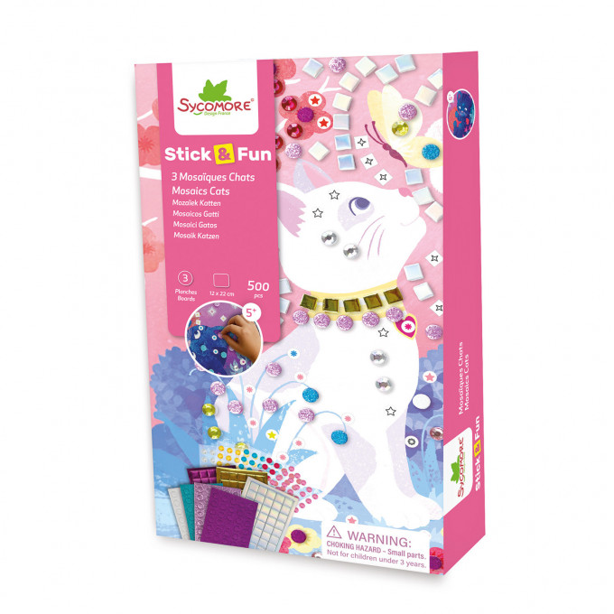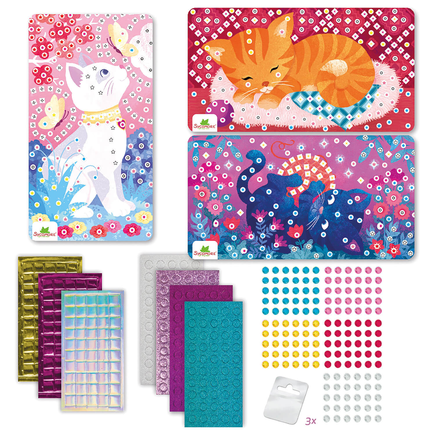 Kreativní volnočasová aktivita pro děti od 5 let. Děti si pomocí pěnových dílků dozdobí 3 efektní obrázky koček. Postupujte podle návodu a postupně dolepujte do obrázku barevné mozaikové tvary a poté kamínky, které obrázkům dodají lesk. Po dokončení obrázků můžete nalepit háček na zadní stranu a zavěsit hotové dílko na zeď v dětské pokojíku. Zdobení mozaikou je zábava, která rozvíjí jemnou motoriku, koncentraci a trpělivost vašeho dítěte.