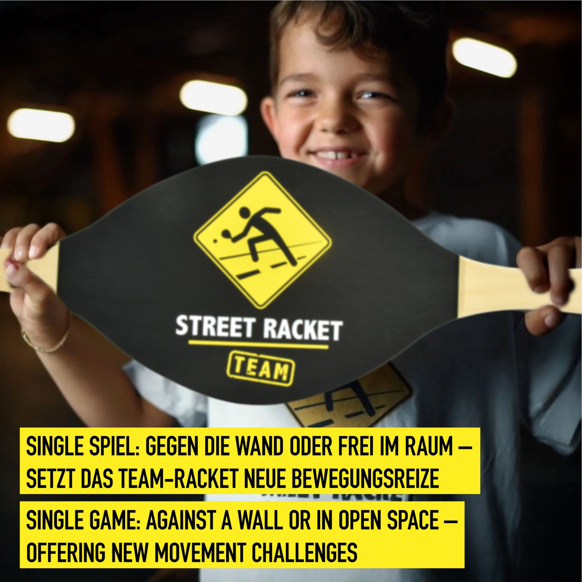 Sportovní vybavení pro dva hráče. Dva hráči drží raketu současně a pohybují se společně směrem k míči. Raketa Street Racket byla speciálně navržena tak, aby hravým a poutavým způsobem podporovala pohyb, týmovou práci a koordinaci. Společný herní zážitek posiluje komunikaci, smysl pro rytmus a motorickou kontrolu, což ji činí ideální pro školy, terapii, rehabilitaci nebo seniorské sporty. Například osobě s postižením lze přímo pomoci s ovládáním míče, nebo může dospělý provádět pohyb společně s dítětem, čímž se aktivita promění ve hru pro všechny generace.