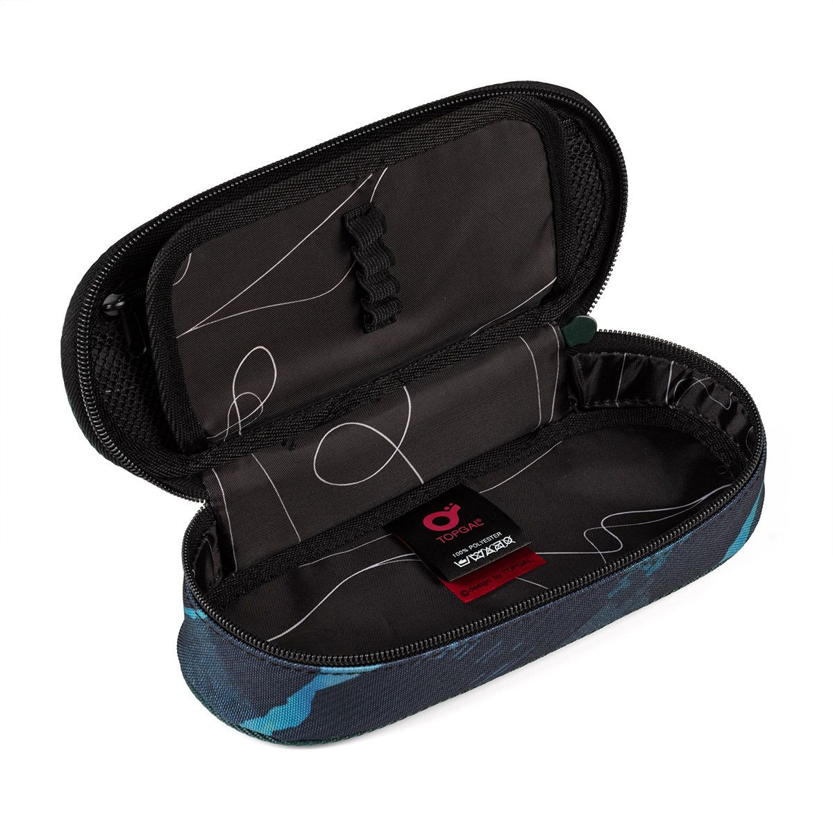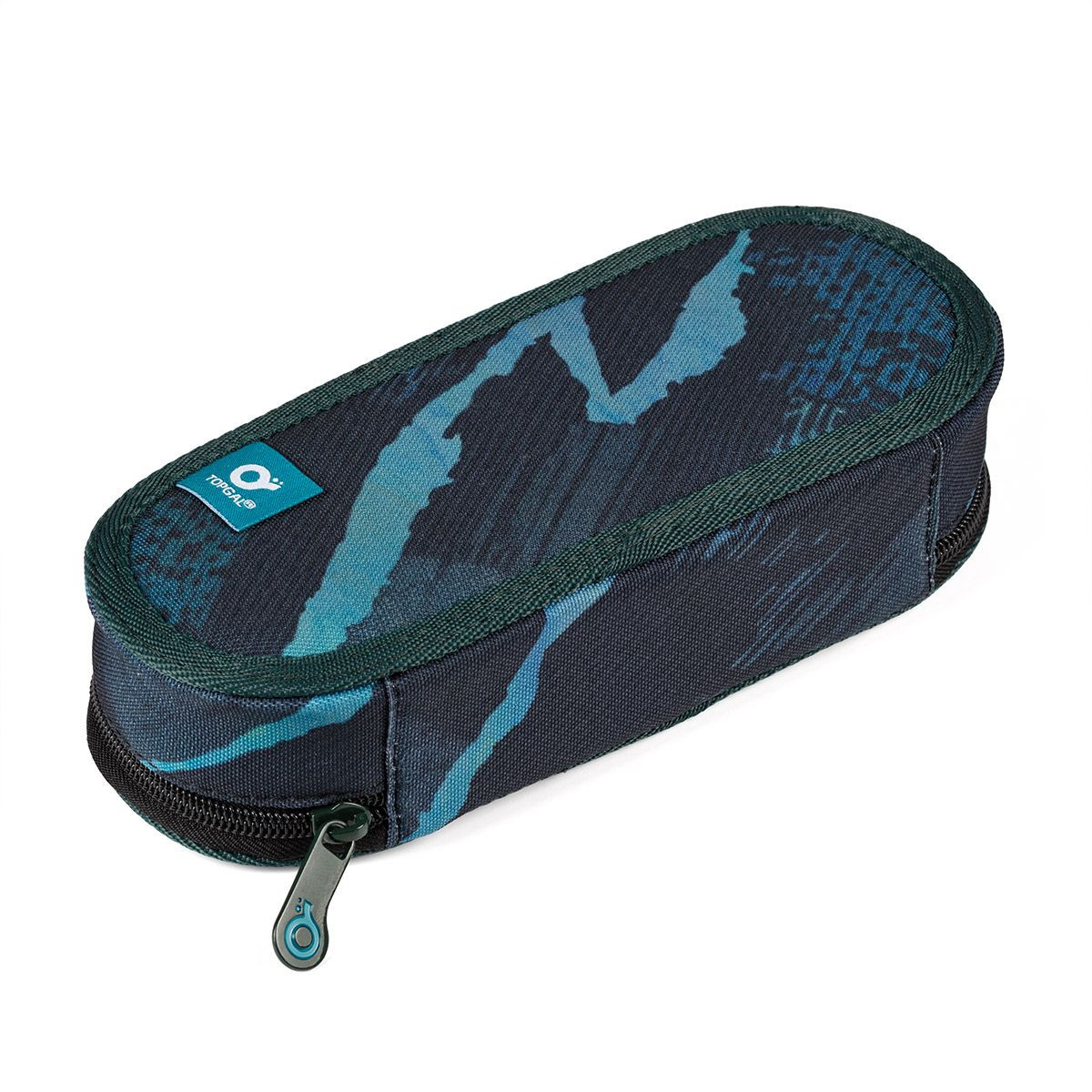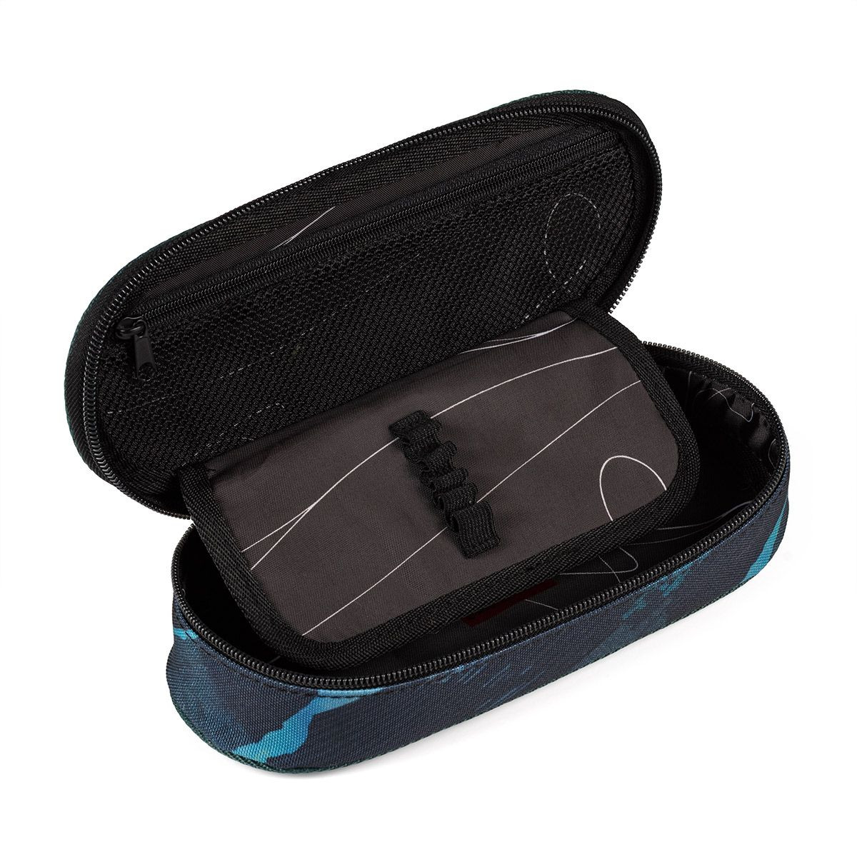Oválný penál pro všechny starší školáky a studenty. Uvnitř pouzdra je síťová kapsička na zip a klopa. Na ní jsou umístěny gumičky pro uchycení celkem devíti tužek a propisek, které je potřeba mít přehledně uspořádané a po ruce. Volný prostor pod klopou slouží pro další psací potřeby – pastelky, fixy, ale i pravítko nebo kružítko.