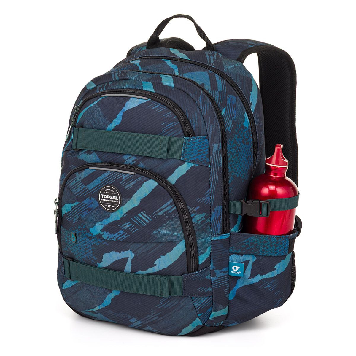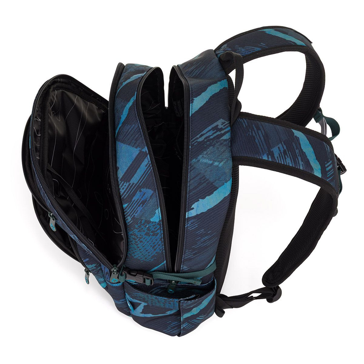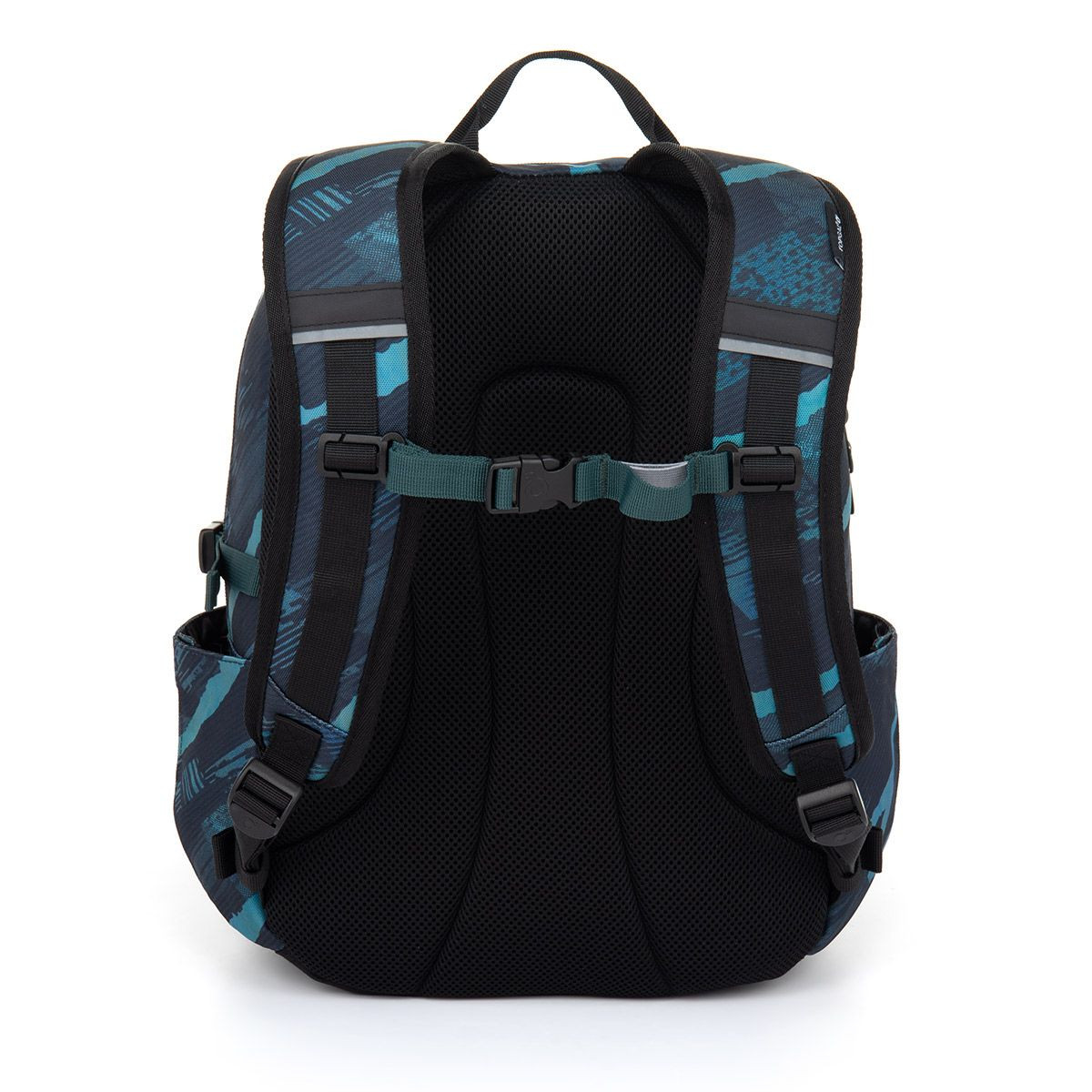 Stylový dvoukomorový batoh VIKI v moderním modro-tyrkysovém vzoru. Lehký, prostorný a pohodlný parťák pro studenty od 145 cm.