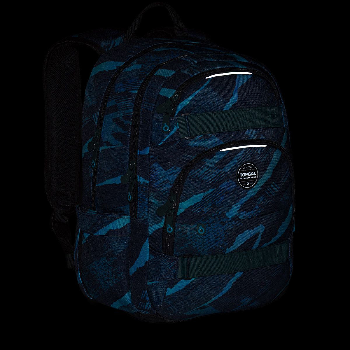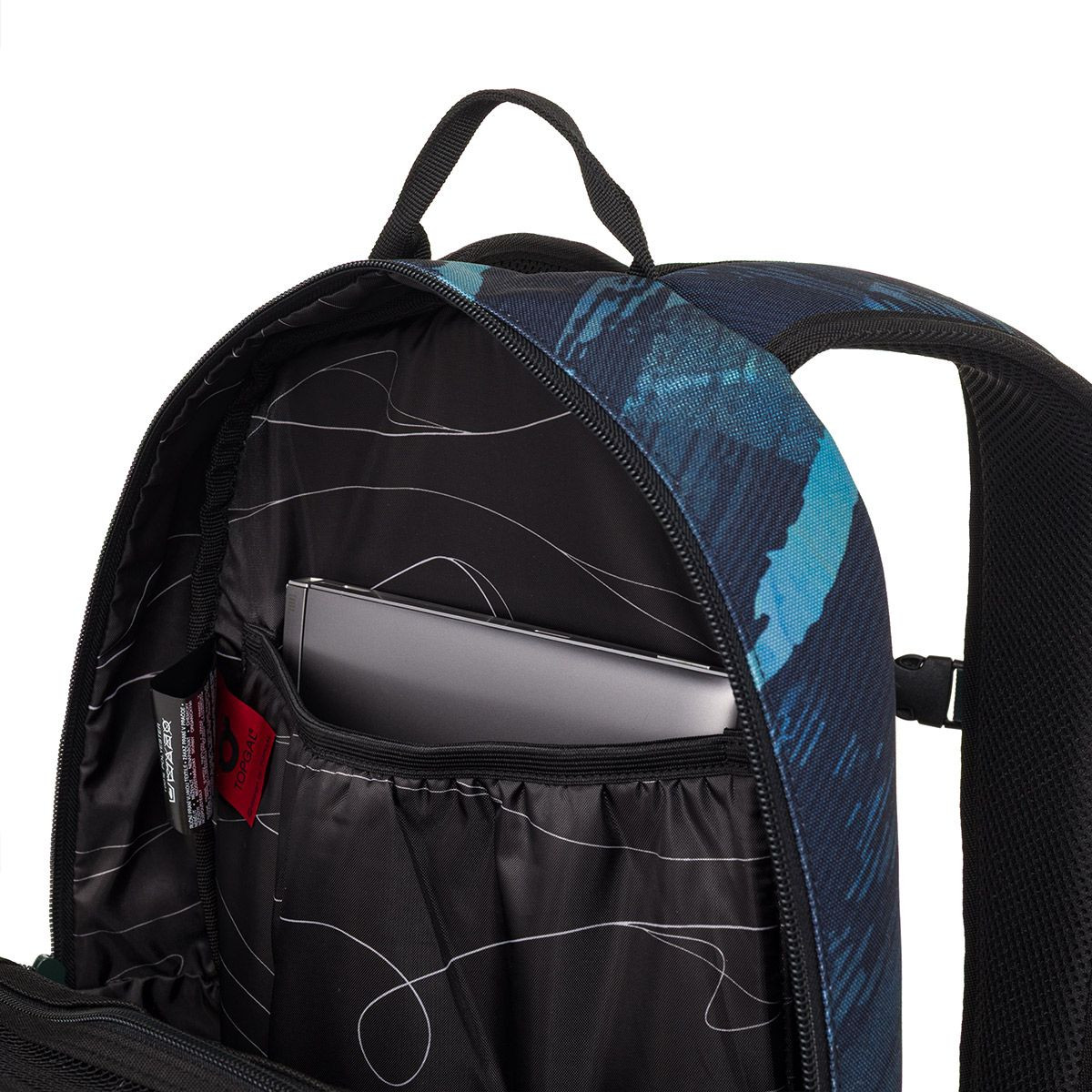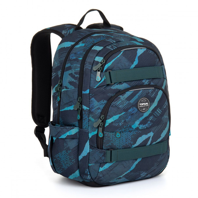 Stylový dvoukomorový batoh VIKI v moderním modro-tyrkysovém vzoru. Lehký, prostorný a pohodlný parťák pro studenty od 145 cm.