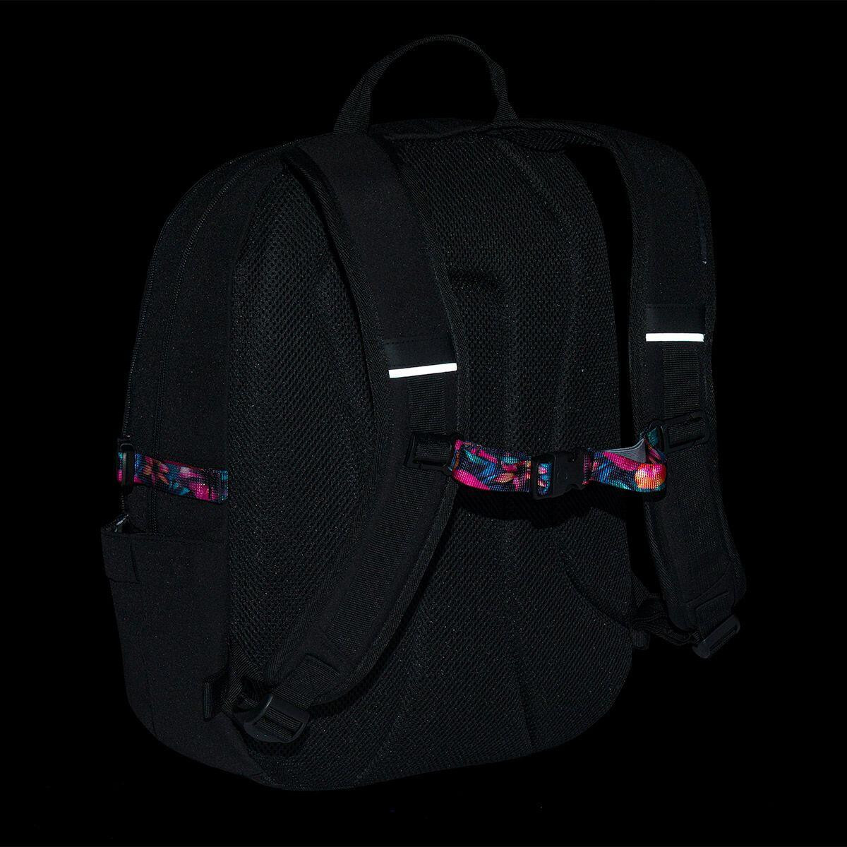 Pohodlí při nošení zajišťují ergonomicky tvarovaná záda z měkké pěny a polstrované popruhy, které dobře rozloží váhu. Batoh je navíc lehký (cca 0,92 kg), takže zbytečně nezatěžuje záda, a díky odolnému dnu a vodoodpudivému materiálu obstojí i v každodenním školním provozu.