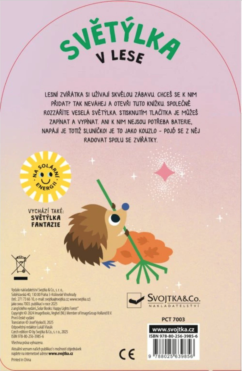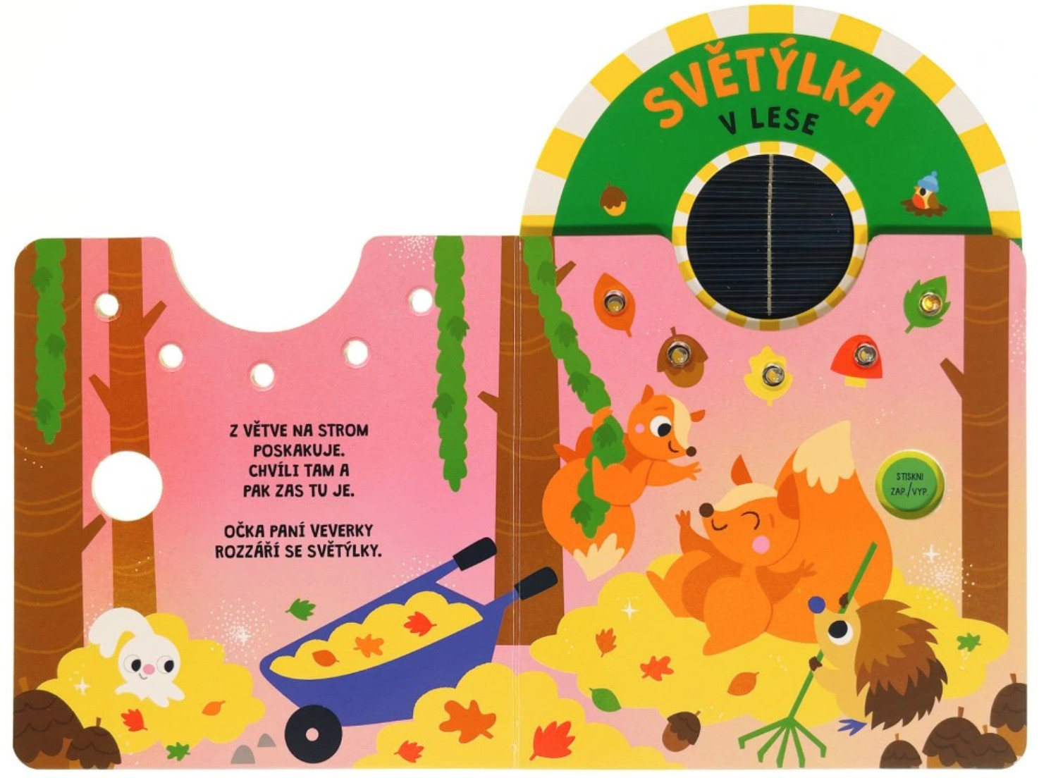 Velkou zajímavostí je, že knížka funguje na solární energii. Stačí ji vystavit světlu a světýlka se aktivují – bez baterií a složitého ovládání. Díky tomu je ideální nejen na čtení doma, ale i venku na zahradě, na pikniku nebo třeba při čekání v kočárku. Děti tak mohou objevovat kouzlo knížky kdekoliv.