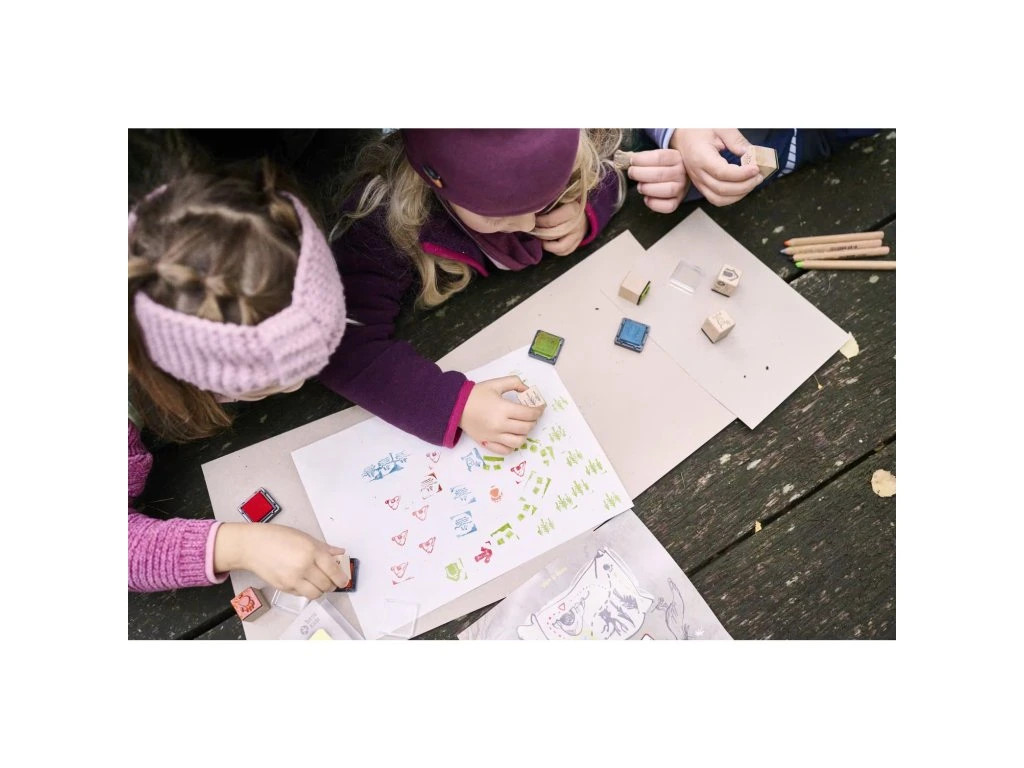 Obsah balení: 8 razítek s různými motivy, 4 razítkové podložky, 3 třpytivé mince s pokladem