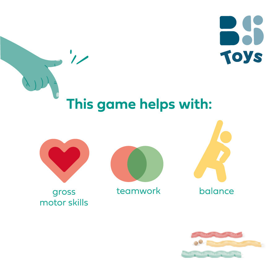 Zábavná týmová hra pro 1-3 hráče od 4 let. Děti pouští kuličky pro dráze ze 3 částí, z nichž každá má jedinečný tvar! Ve hře děti spolupracují, drží části dráhy a snaží se plynule posouvat kuličku z jednoho dílu na druhý a udržet ji v pohybu, aniž by spadla.