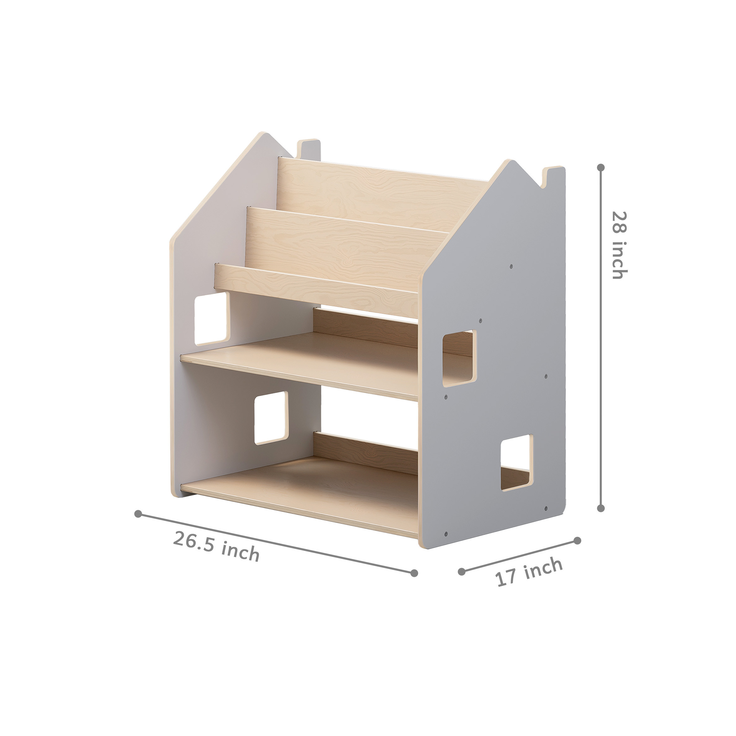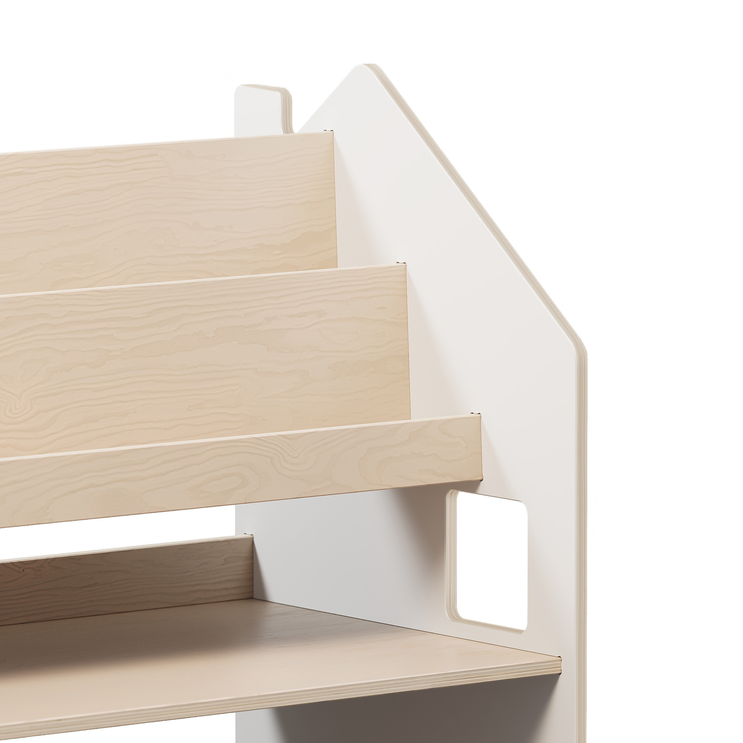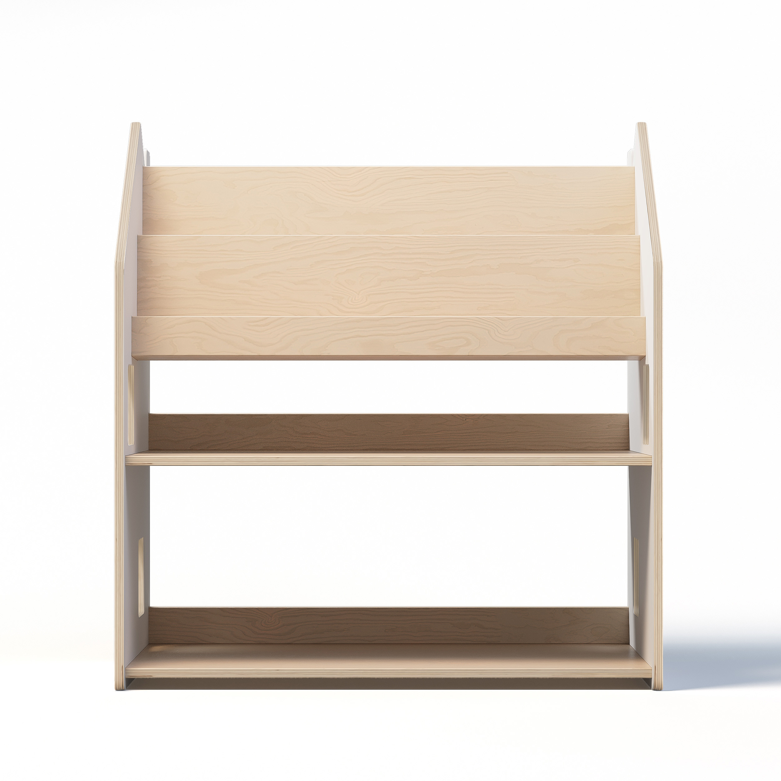 Montessori regál 2 v 1, který podporuje samostatnost a pořádek u dětí. Děti si mohou samy vybírat a ukládat knihy i hračky, přičemž obálky knih jsou dobře viditelné. Regál nabízí čtyři police a zadní úložný prostor, je vyroben z kvalitní lakované březové překližky, stabilní a bezpečný s oblými hranami.