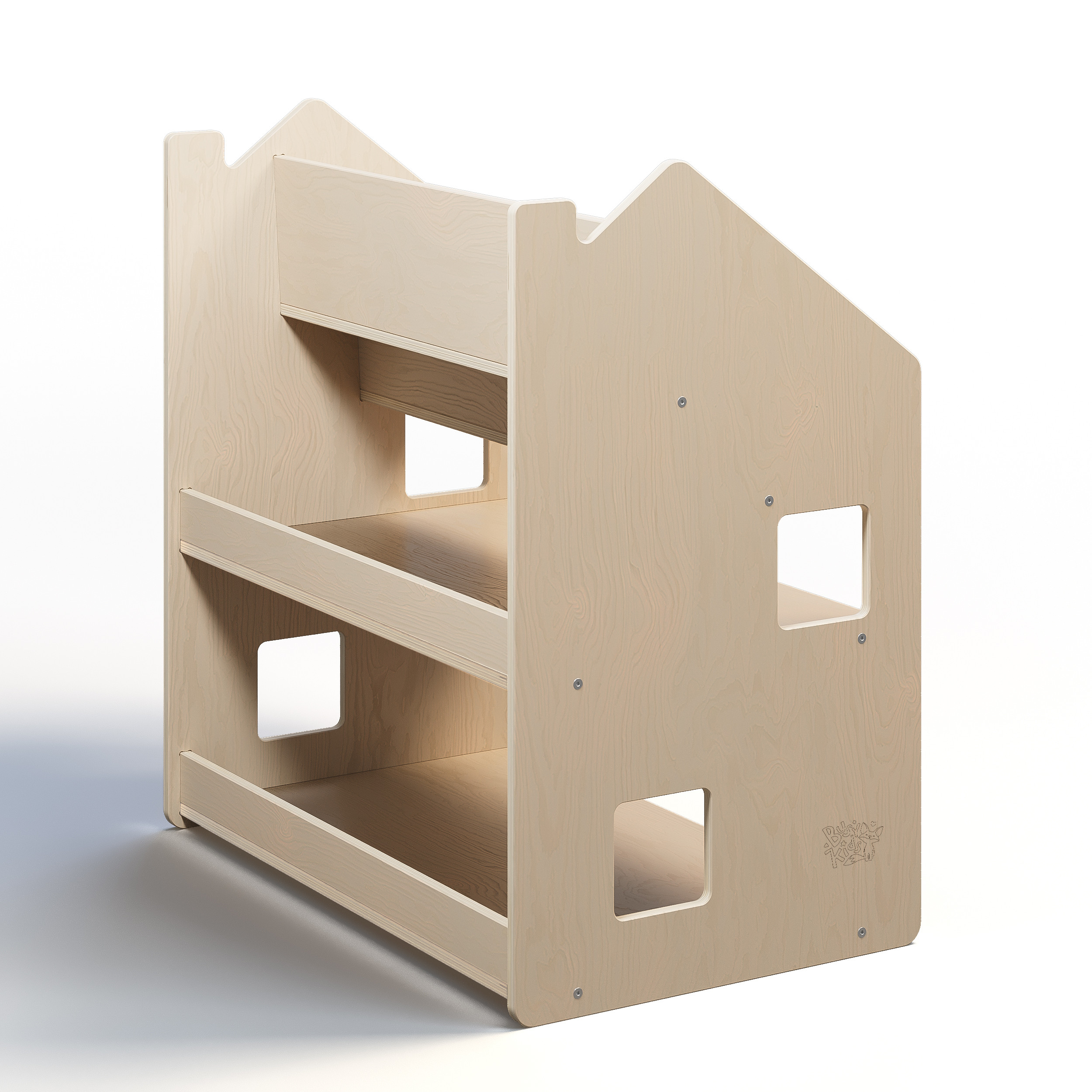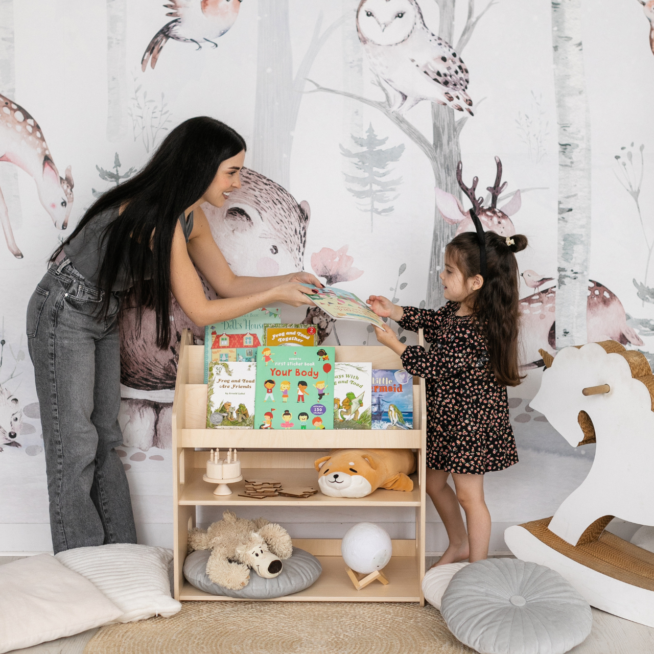 Montessori regál 2 v 1, který podporuje samostatnost a pořádek u dětí. Děti si mohou samy vybírat a ukládat knihy i hračky, přičemž obálky knih jsou dobře viditelné. Regál nabízí čtyři police a zadní úložný prostor, je vyroben z kvalitní lakované březové překližky, stabilní a bezpečný s oblými hranami.