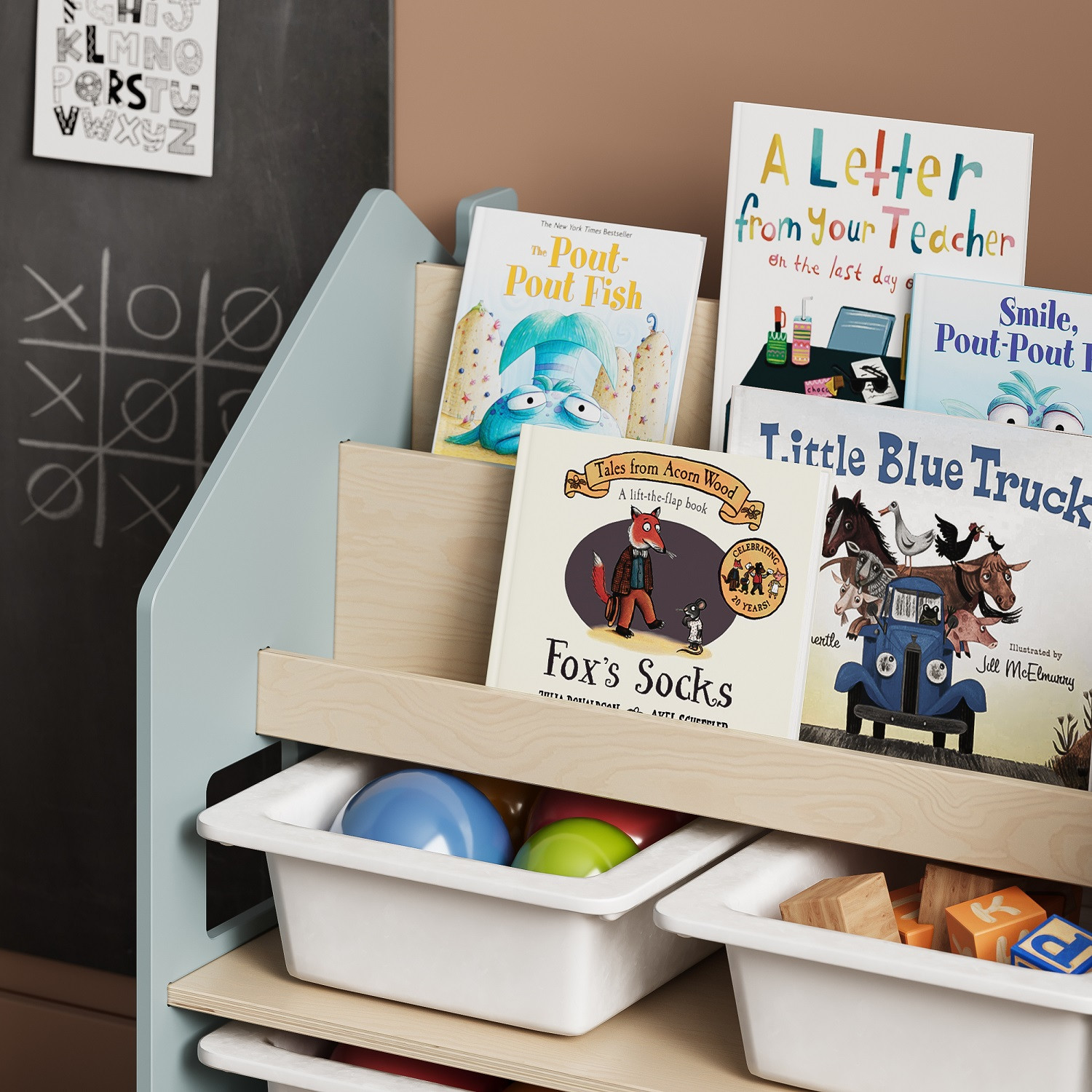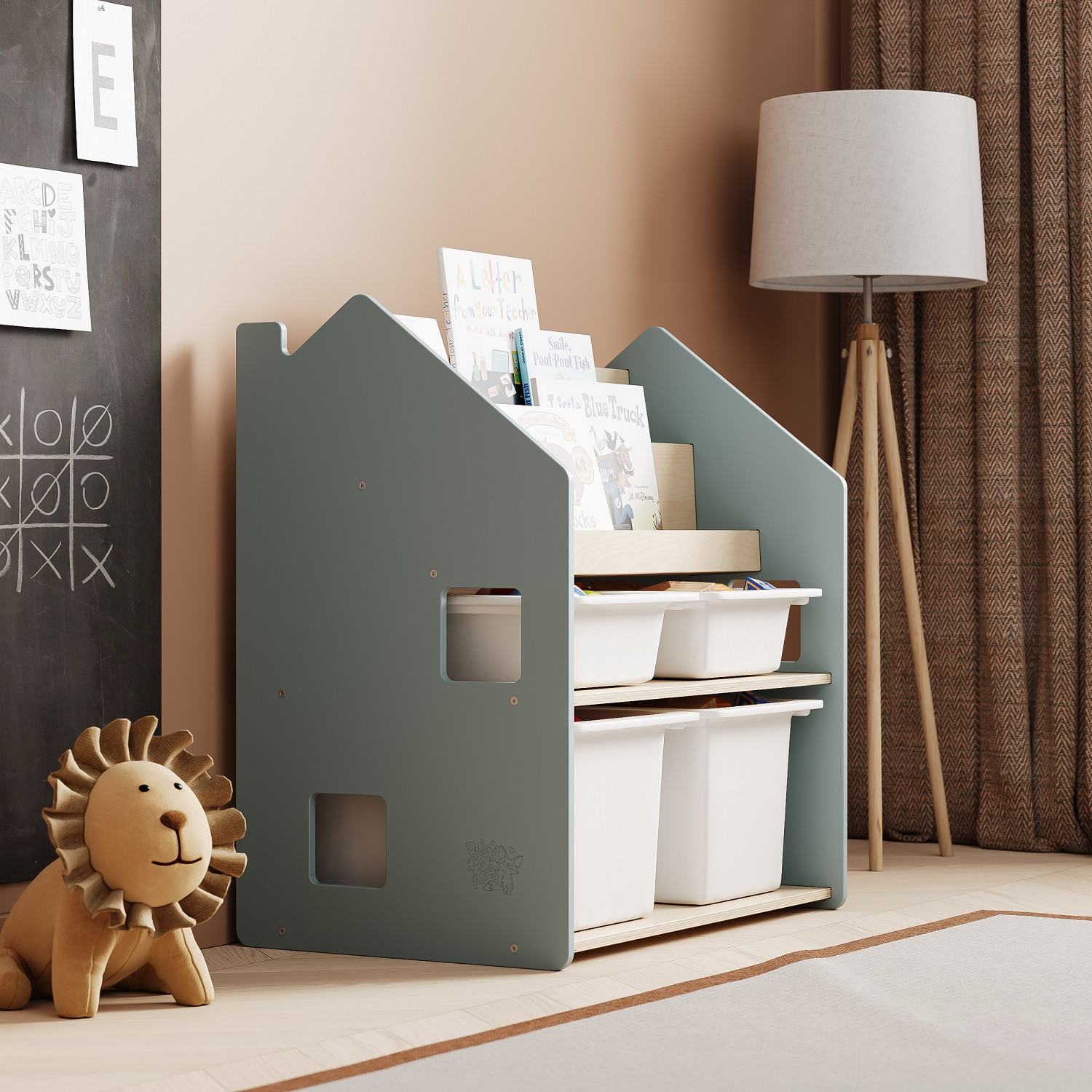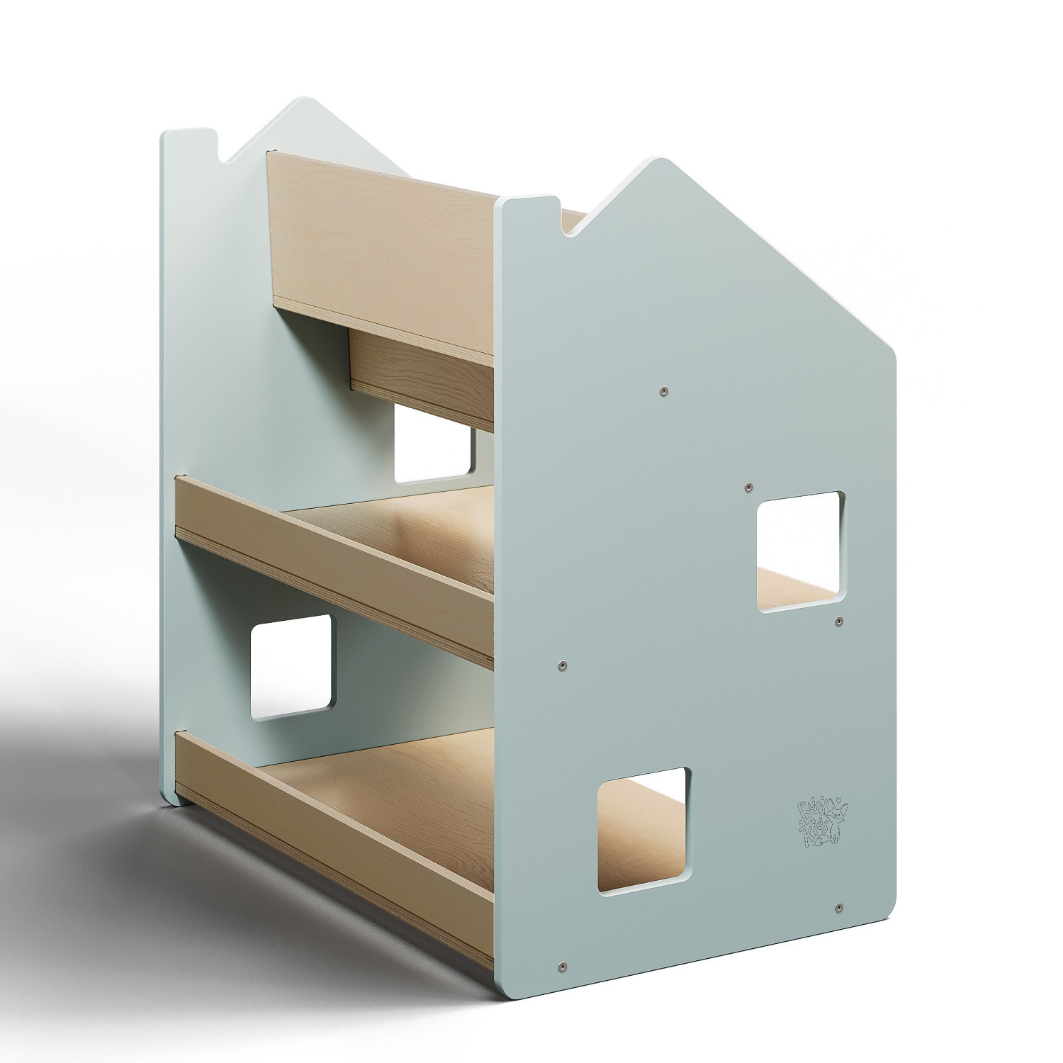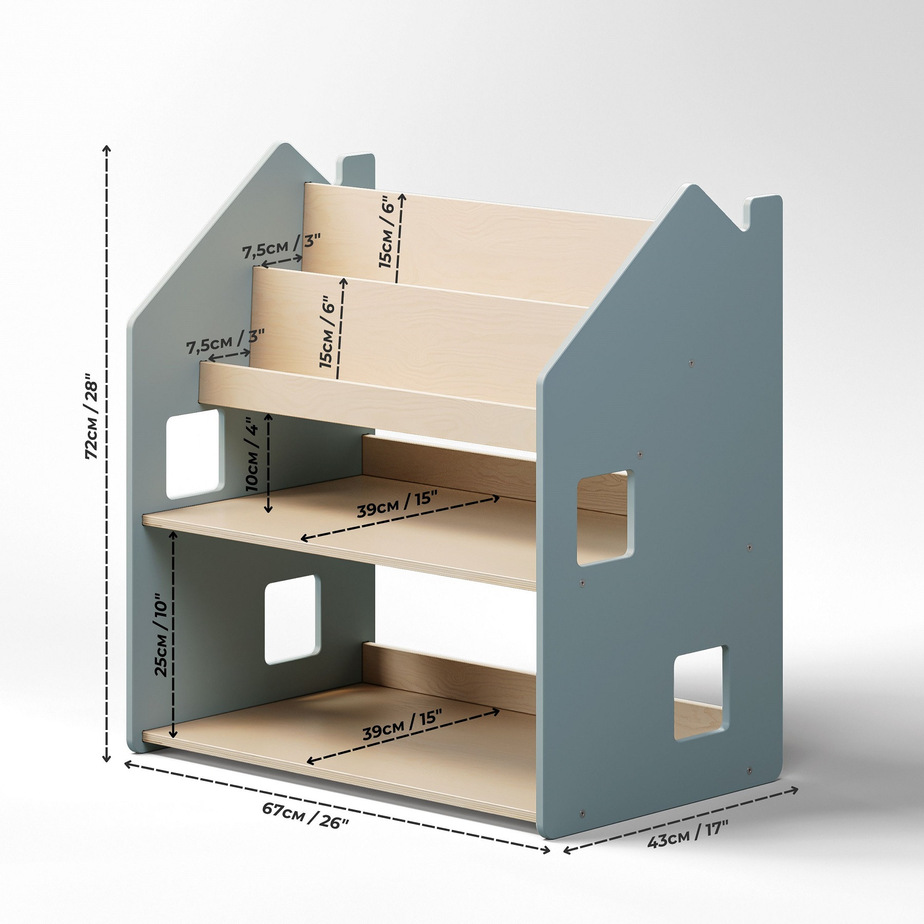 Montessori regál 2 v 1, který podporuje samostatnost a pořádek u dětí. Děti si mohou samy vybírat a ukládat knihy i hračky, přičemž obálky knih jsou dobře viditelné. Regál nabízí čtyři police a zadní úložný prostor, je vyroben z kvalitní lakované březové překližky, stabilní a bezpečný s oblými hranami.