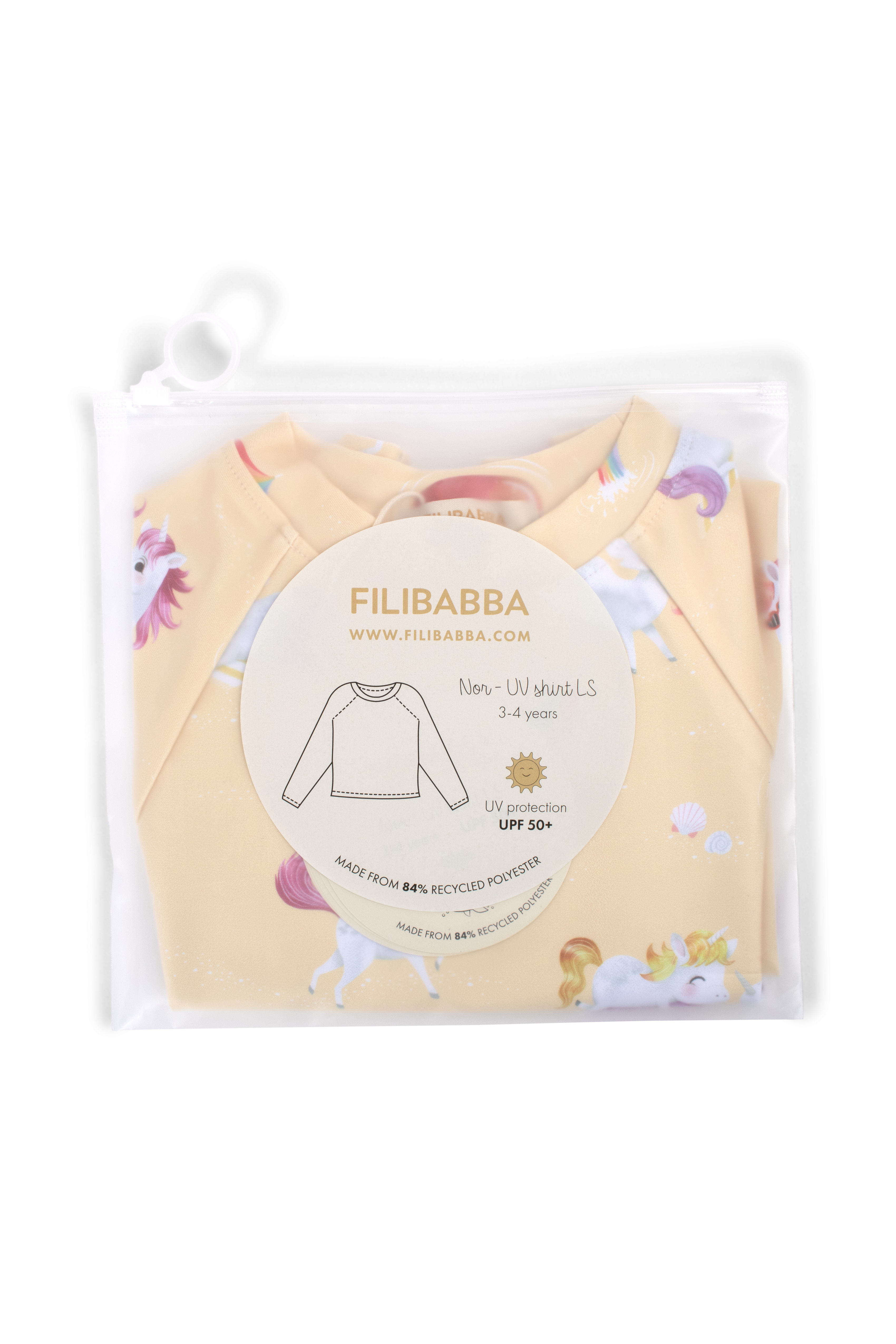 Objevte tento kouzelný vzor. Okouzlující jednorožci kloužou po duhách a jemně tančí mezi vlnami, zatímco zvědavý malý narval vykukuje ze třpytivého moře. Na jemném žlutém pozadí se rozvíjí snový letní svět plný fantazie a úžasu.