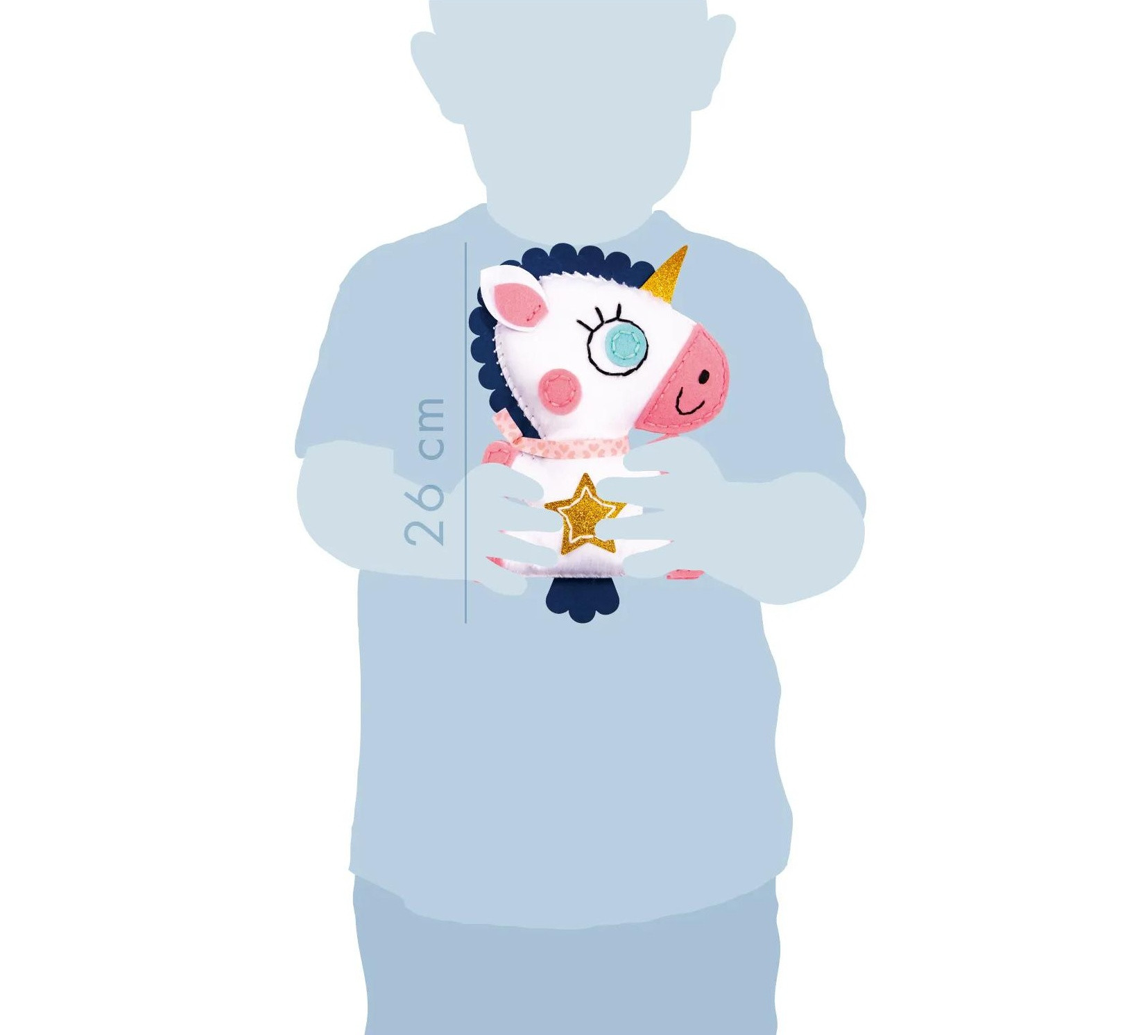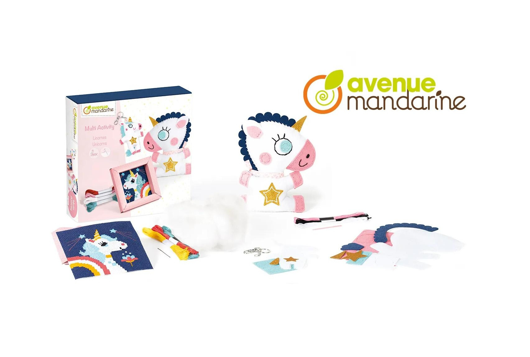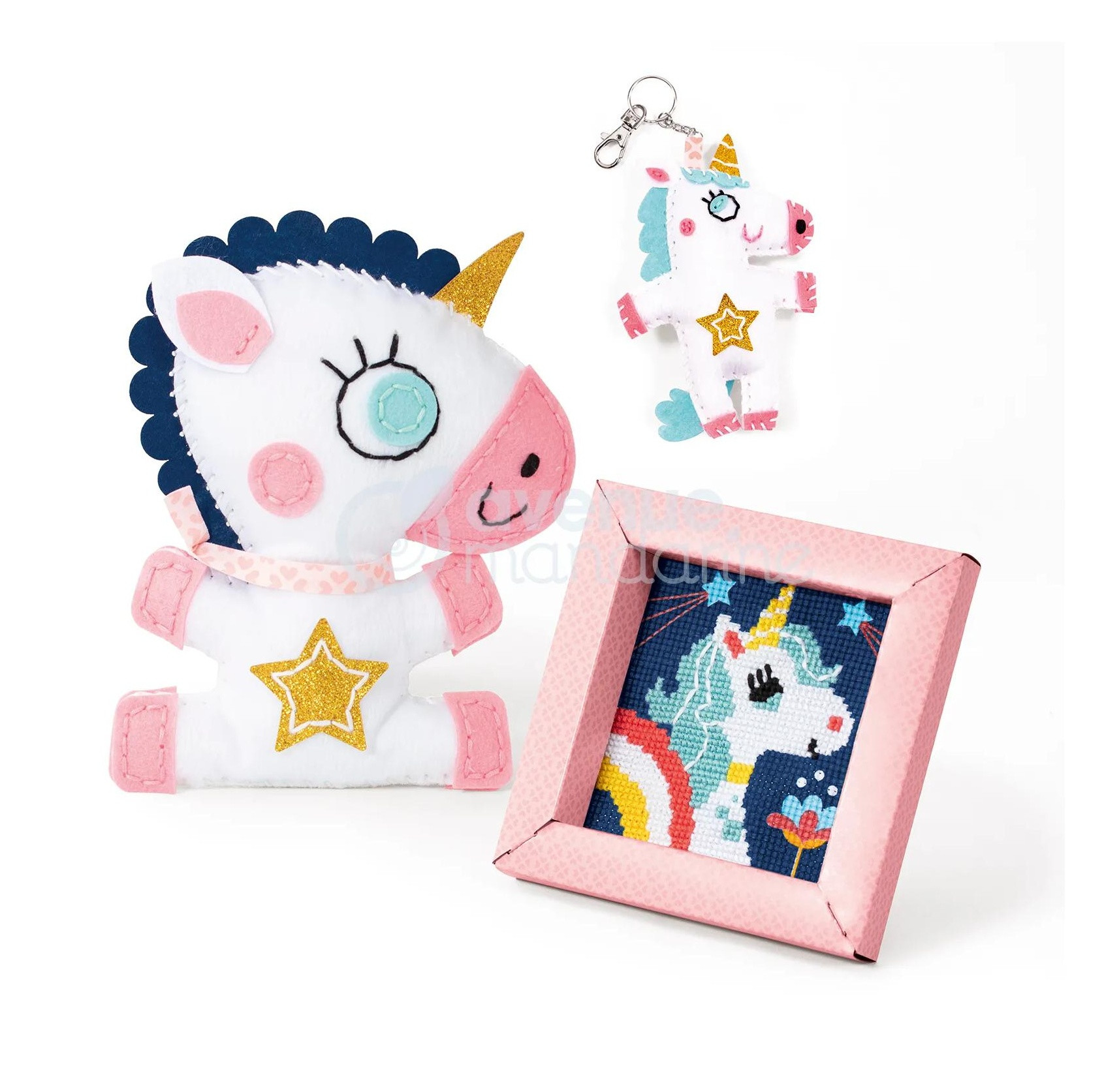 Obsah balení: předstřižené perforované filcové díly, plastovou jehlu, výplňový materiál a bavlnky k ušití hračky, předloha k vyšití jednorožce, 4 bavlnky, jehla, kartonový rámeček na hotový obrázek, předstřižené perforované filcové díly, plastovou jehlu, výplňový materiál, bavlnky, kovová karabina k vyšití přívěsku, přehledný obrázkový návod.
