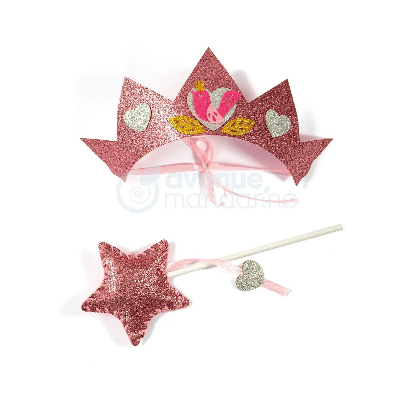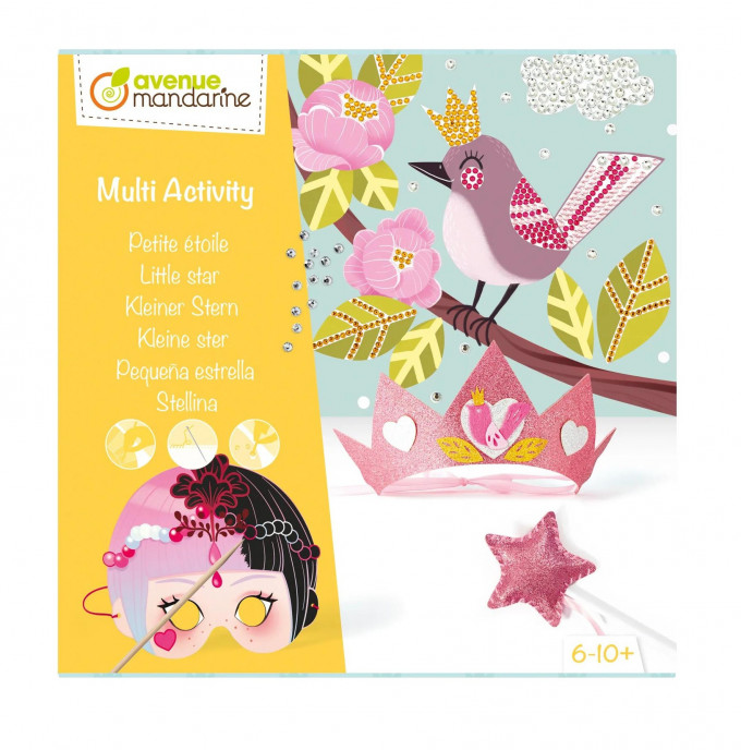 Tato kreativní sada nabízí tři zábavné aktivity v jednom balení pro děti od 6 do 10 let. Děti si vlastnoručně ušijí korunku a kouzelnou hůlku, dozdobí kartonové obrázky třpytivými mozaikovými diamanty a vytvoří originální masky pomocí vyškrabávací techniky.