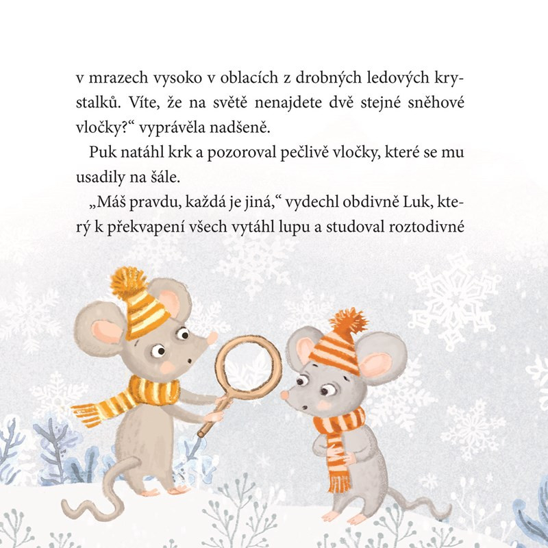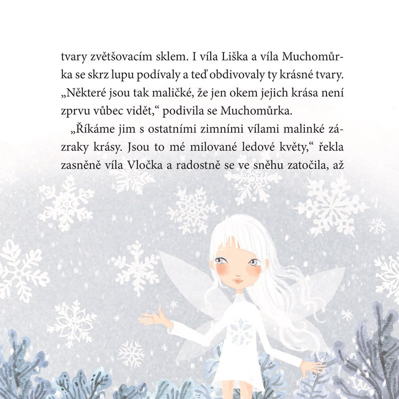 Oblíbená víla se vrací! Kouzelný příběh o přátelství, pomoci druhým a kráse zimní přírody. Tentokrát se víla Muchomůrka se svými kamarády vydává na dobrodružnou výpravu zasněženým lesem. Všichni hledají ztracenou medvědici, která odešla ze svého doupěte uprostřed zimního spánku. Průvodkyní jim je víla Vločka, která je oproti našim kamarádům v zimní krajině jako doma. Nejen že jim pomůže, ale taky se toho díky ní o zimě hodně dozvědí. Na cestě potkají nové přátele a také odhalí, že zima není jen studená a tichá – má své kouzlo a skrývá v sobě i velká překvapení. Čtení pro děti od 6 let.