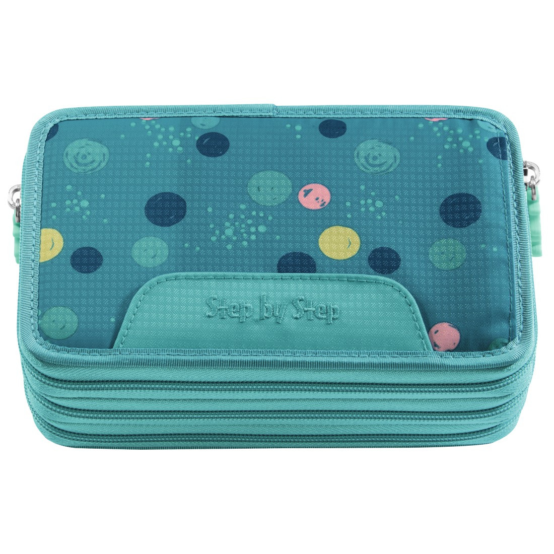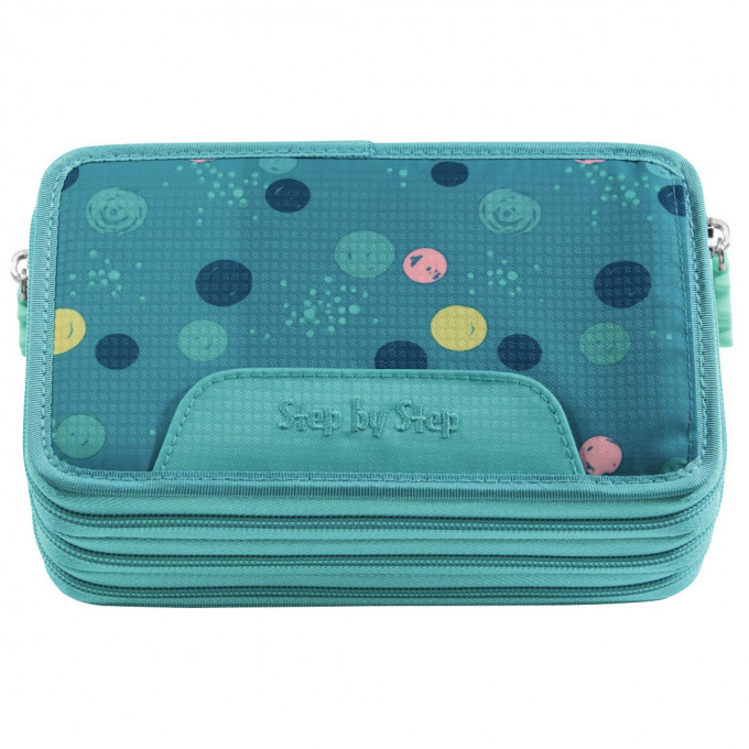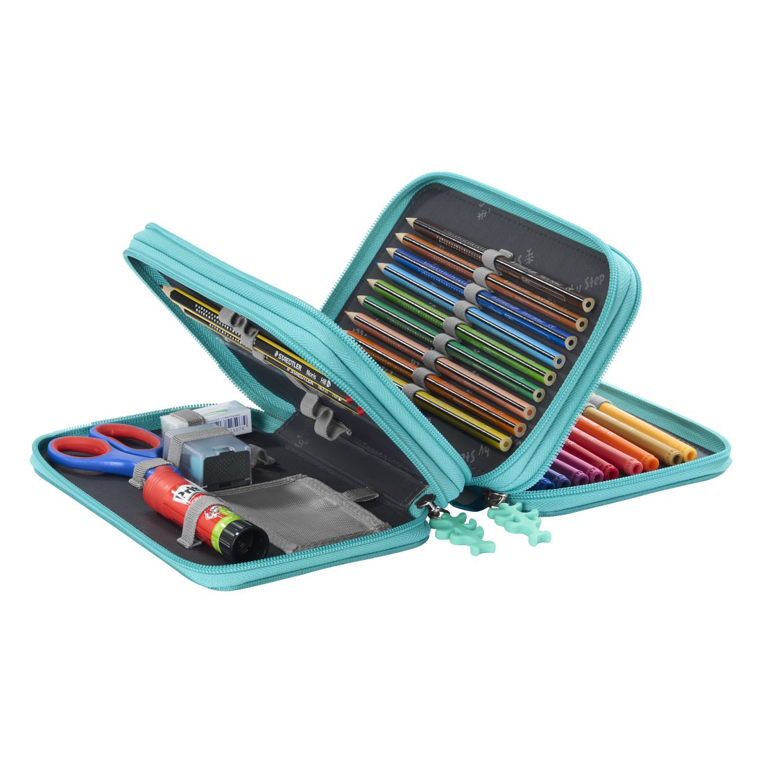 Třípatrový penál pro děti od 1. třídy ZŠ je plně vybaven značkovými psacími potřebami (43 kusů). Penál je uzavíratelný na zip. Uvnitř je malá průhledná kapsička na drobnosti uzavíratelná na suchý zip. Každou přihrádku lze otevřít zvlášť, což usnadňuje přístup k perům a dalším předmětům.