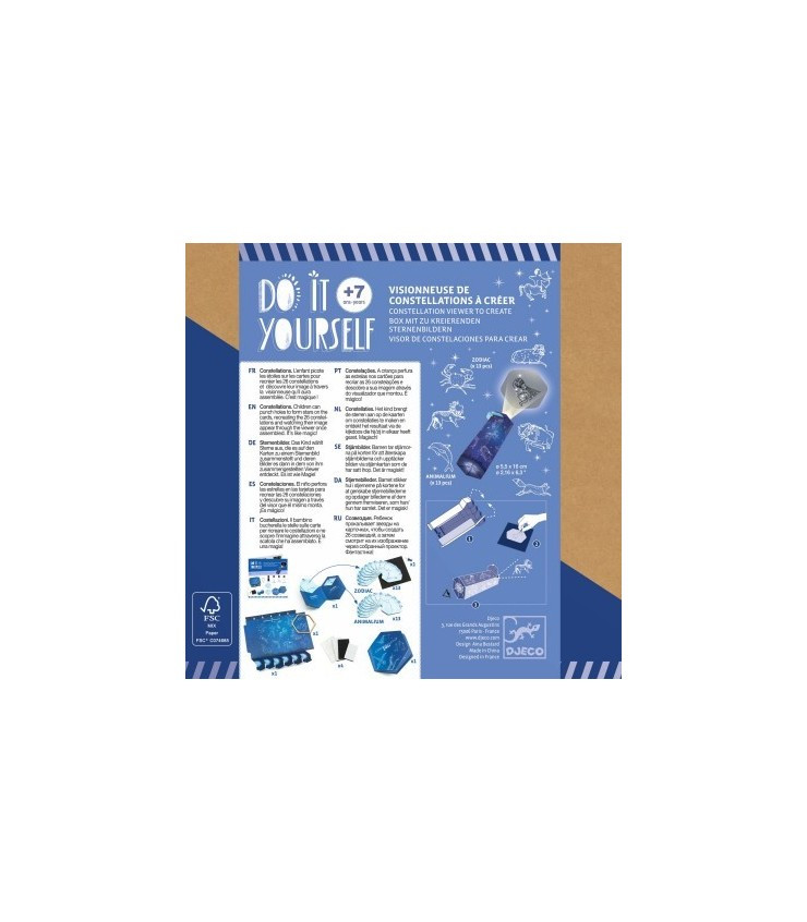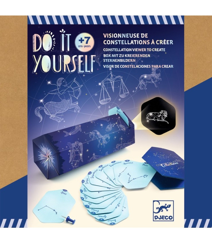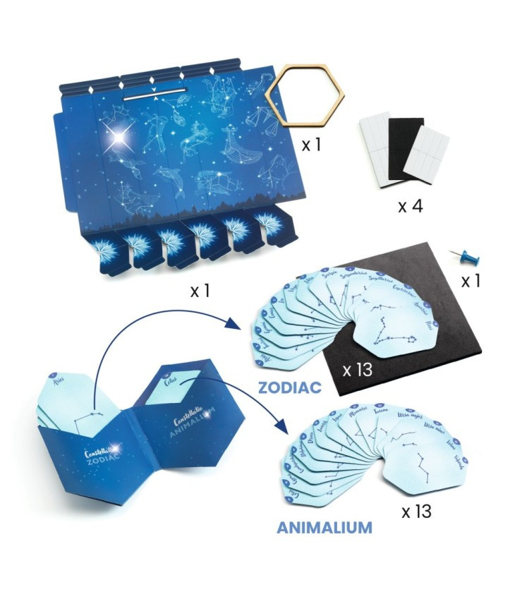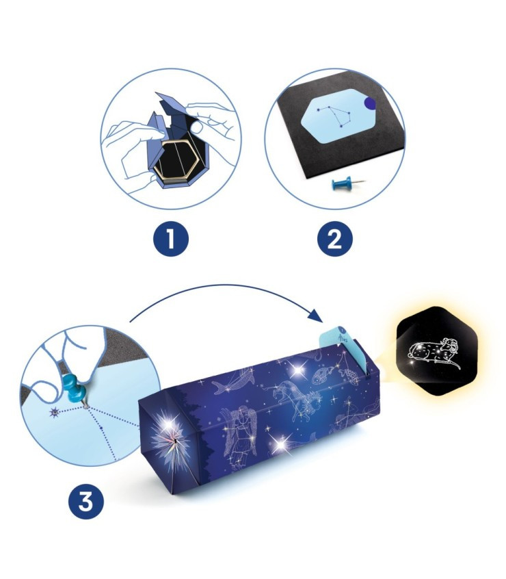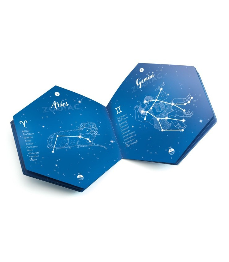 Kreativní sada pro děti od 7 let. Nejdříve sestavte prohlížeč. K dispozici mají děti 26 vybraných souhvězdí (znamení zvěrokruhu a zvířecí souhvězdí). Vyberete si jednu kartičku, kterou zasunete do prohlížeče a jako mávnutím kouzelného proutku se objeví skrytá ilustrace souhvězdí. Ideální dárek, který v dětech probudí zájem o pozorování hvězd a krásu noční oblohy.