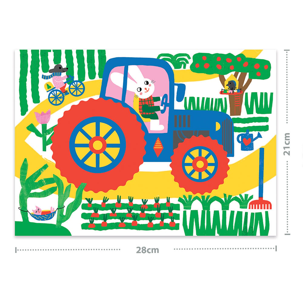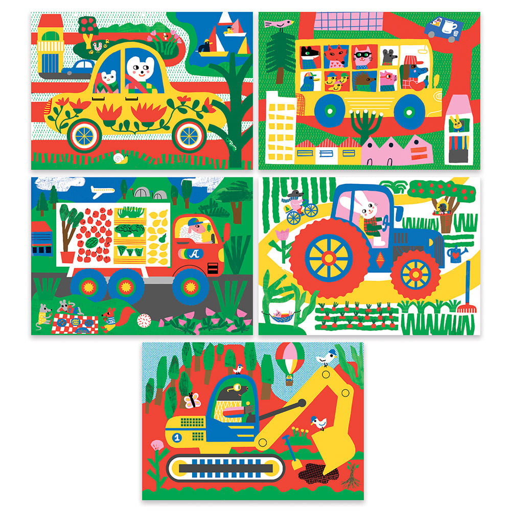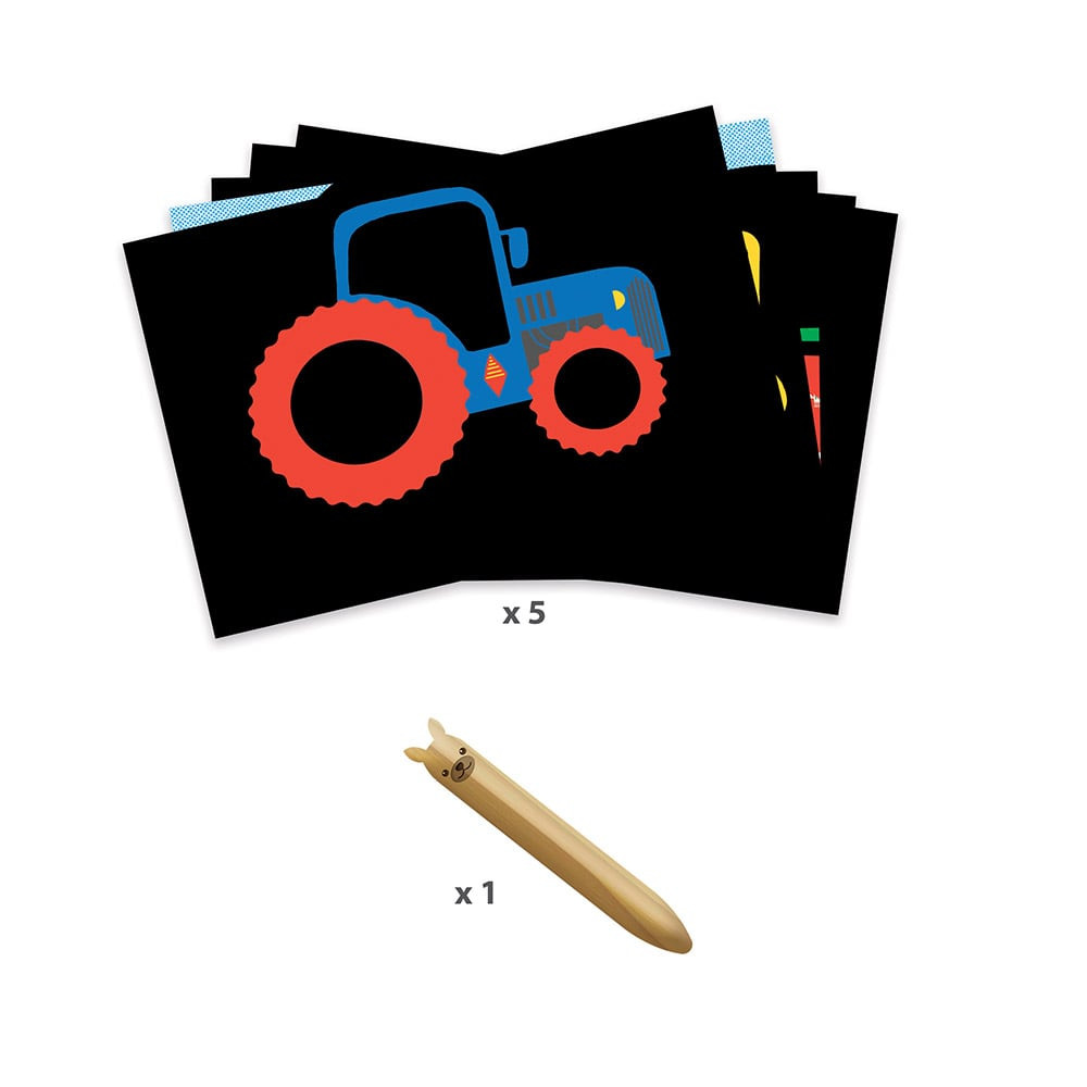 Sada 5 velkých stíracích obrázků s motivem vozidel pro děti již od 18 měsíců. K dispozici mají děti velké dřevěné oboustranné vyškrabávátko, které jim krásně padne do ruky. Děti seškrabávají povrch karet a sledují, jaké překvapení se pod horní vrstvou skrývá – je to tak zábavné!