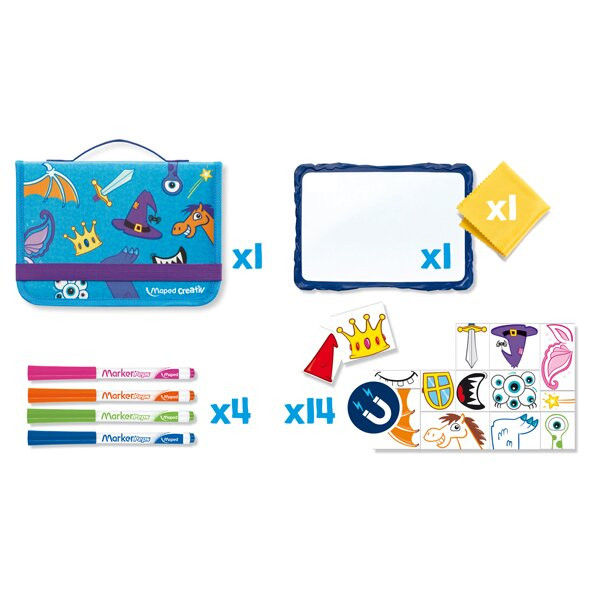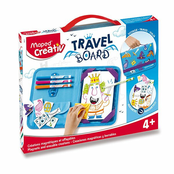 Cestovní kufřík Travel Board obsahuje 1 magnetickou tabulku, 4 barevné fixy Marker´Peps, 14 magnetických obrázků a hadřík. Magnetickou tabulku je možné uchytit, pro snadnější malování, v kufříku. Na tabulku lze malovat fixami, malby lze případně kreativně doplnit o magnetické obrázky. Fixy se dají z tabulky smazat a malovat lze opakovaně znovu.
