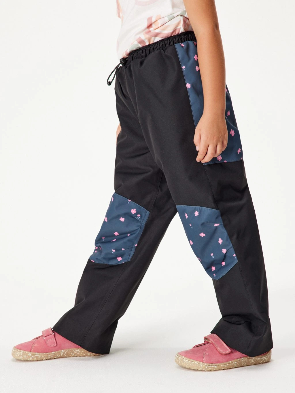 Kalhoty mají rovný padnoucí střih, který se přizpůsobí více typům postav, vysoký pružný náplet v pase drží na místě bez tlačení a umožňuje pohodlný pohyb. Výrazný, ale přesto jemný květinový motiv na černém podkladu přidává stylovou linku, která dělá z kalhot oblíbený kus v dětském šatníku.